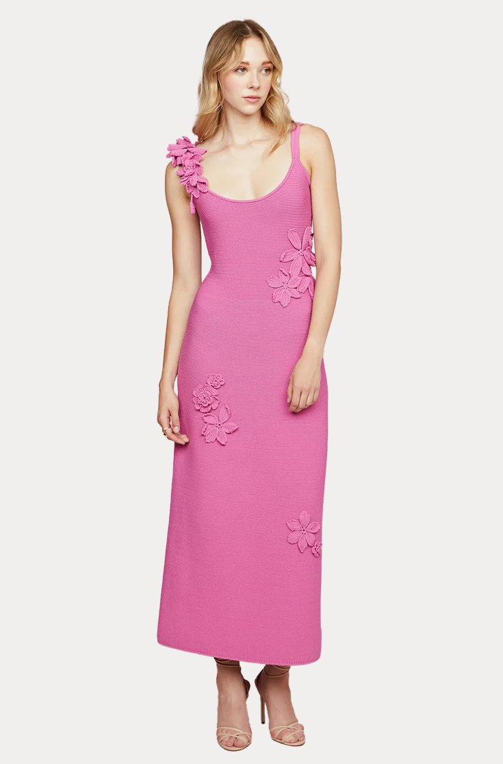 Dense sponge knit adorned with hand-crocheted flowers cascading across the body. A bold statement shoulder adds a unique, textural touch.