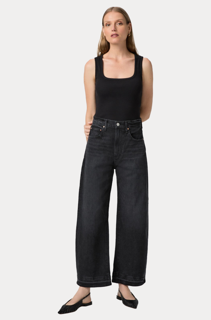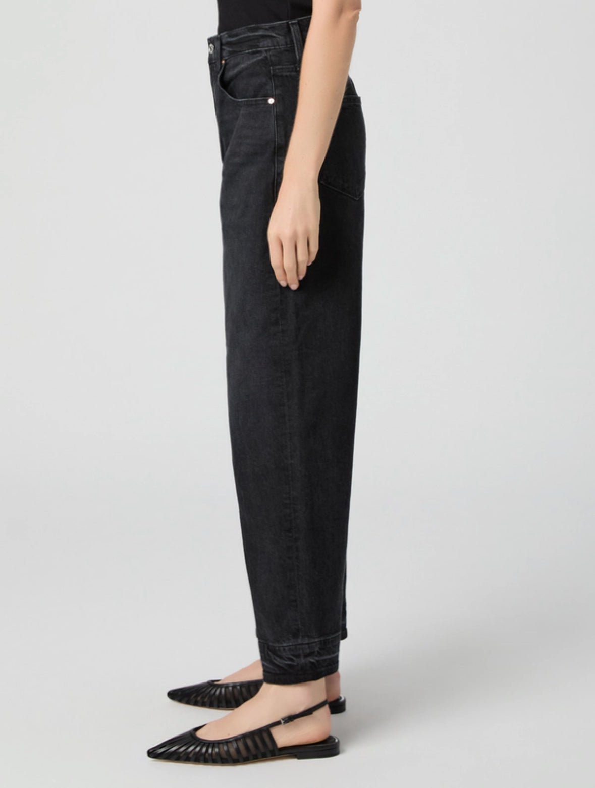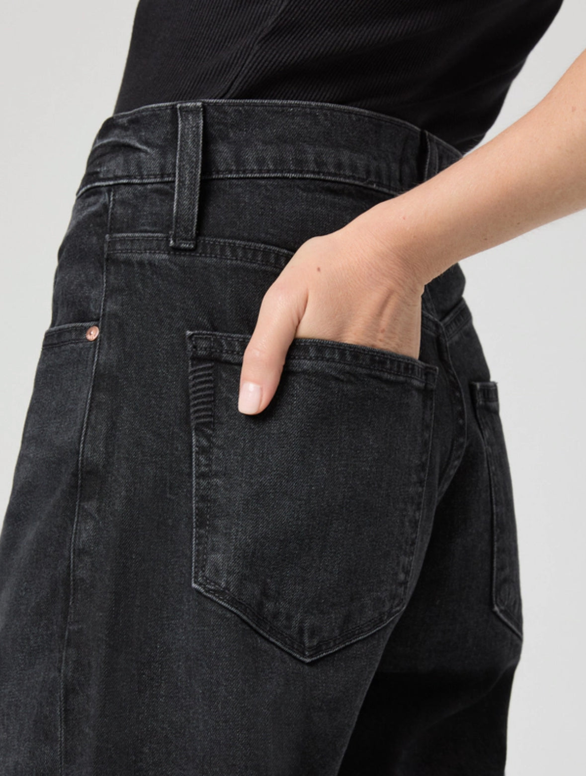 The Arellia Ankle is our high-rise barrel leg silhouette with a cropped ankle-length inseam. In an elevated black wash with an undone finished hem, this pair is crafted from heritage-inspired denim with a soft hand-feel and a hint of stretch.