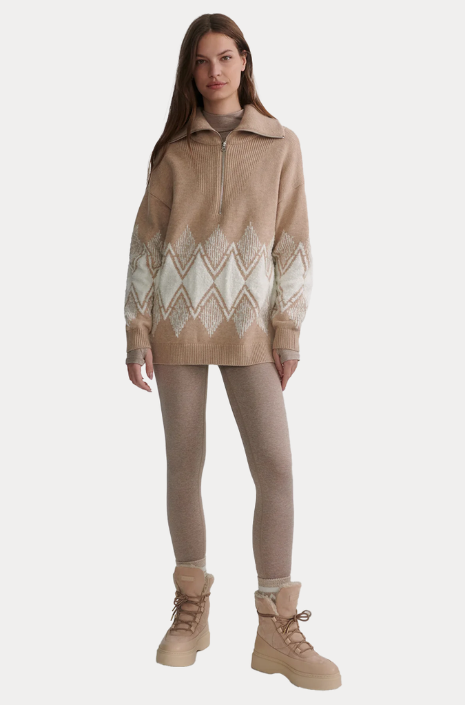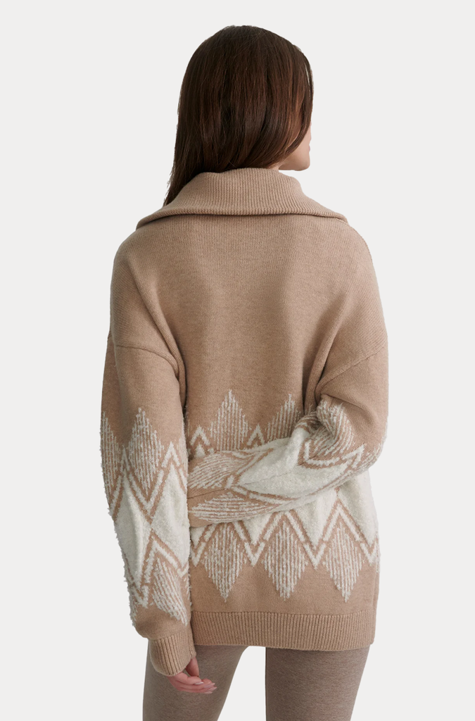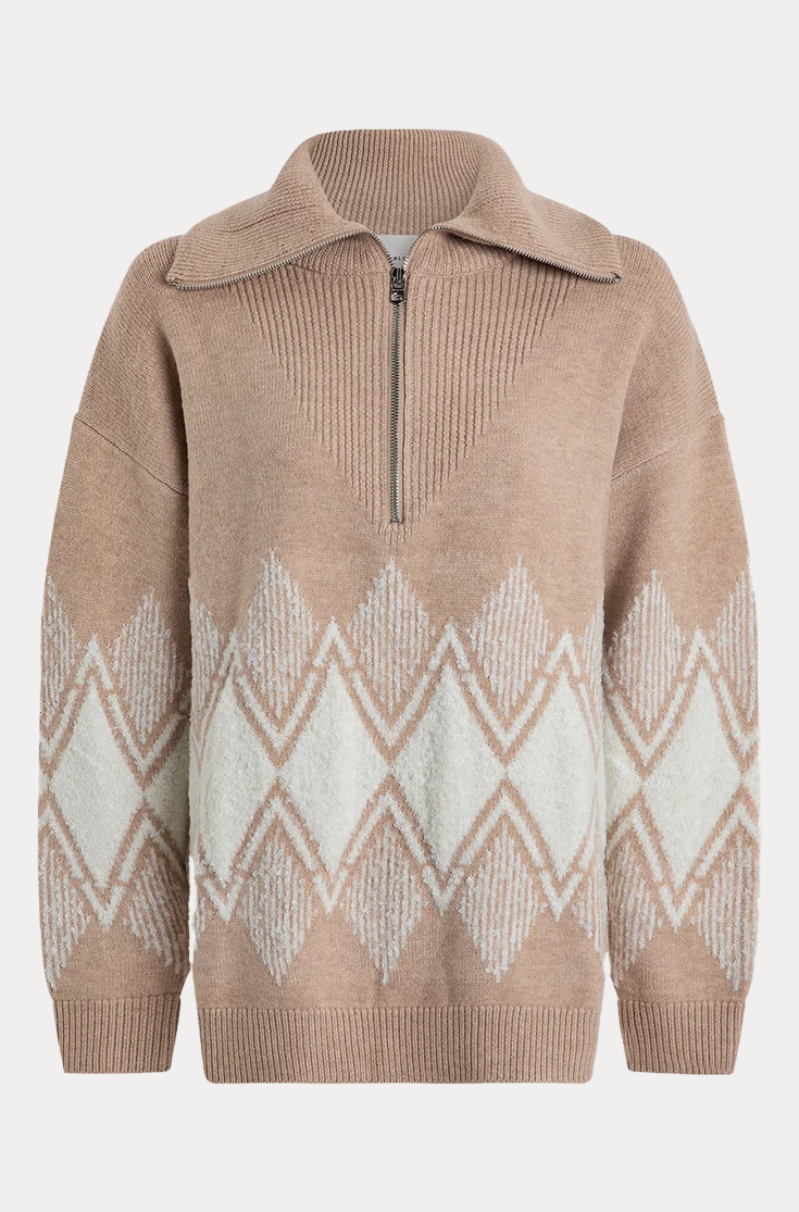 Set a statement in the cold with the Betty, an oversized jacquard half-zip knit with a textured bouclé diamond pattern. A refined yet comfortable addition to your cold-weather wardrobe, it's finished with a stylish turn-back collar and a V-shaped knitted rib panel. Pair with the matching Ethan knit hood for added warmth.