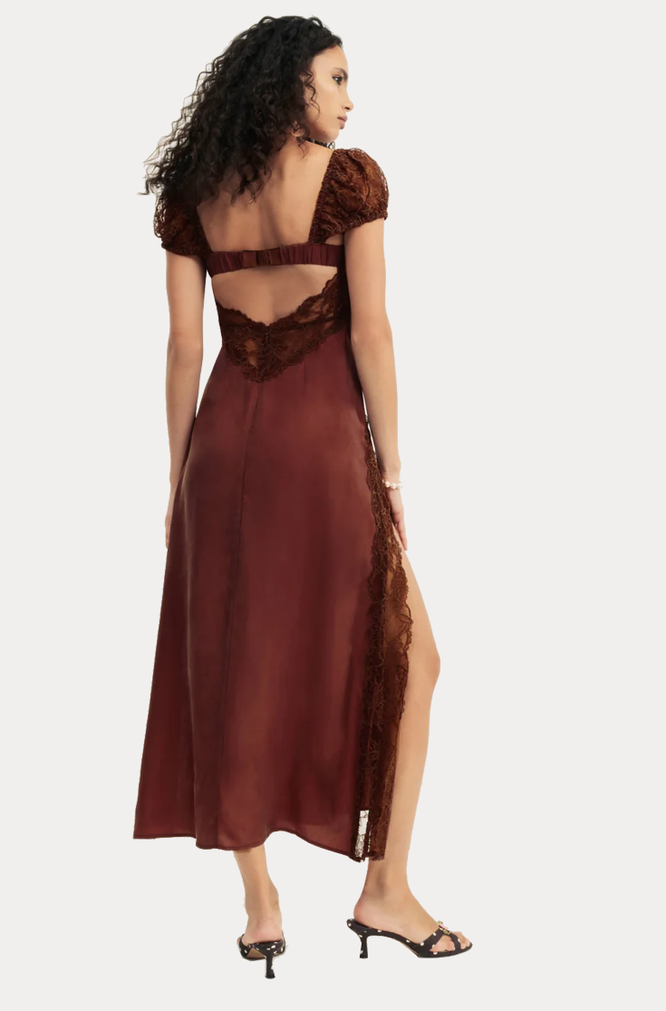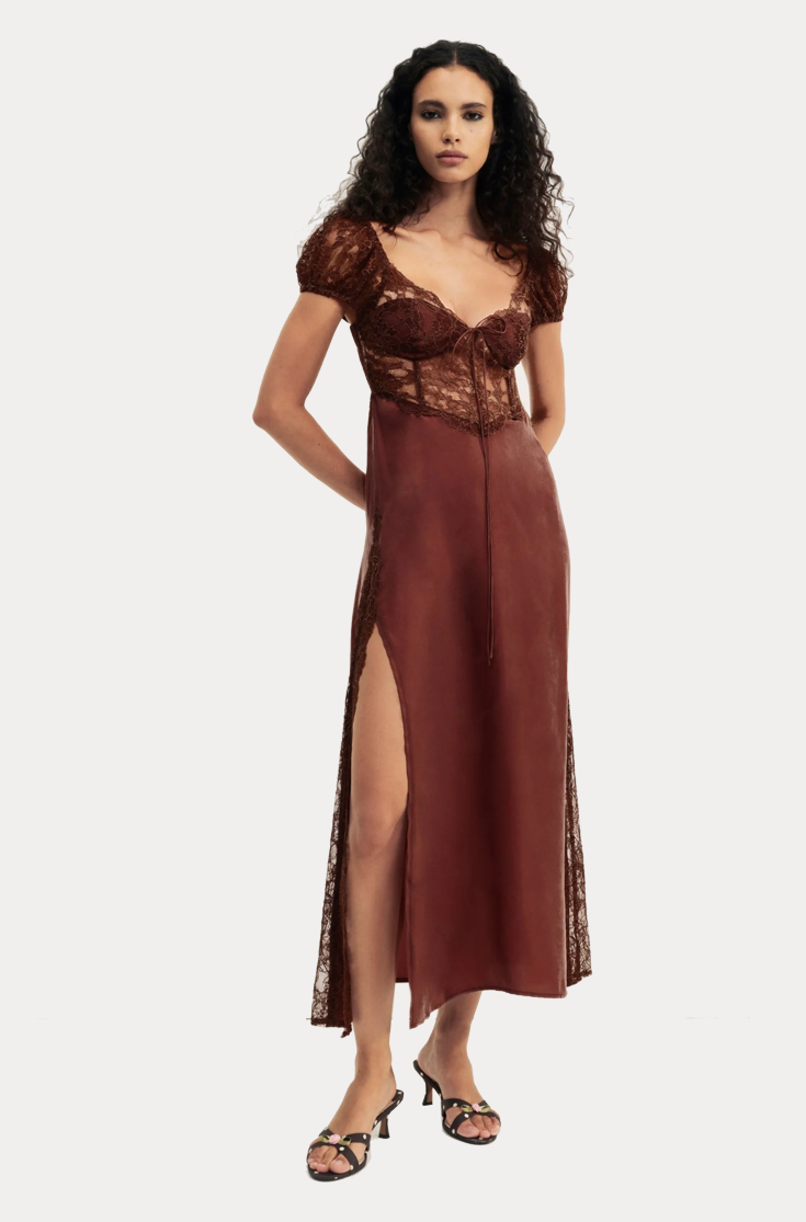 Become the best dressed guest in the Casey Maxi Dress. Designed with puff sleeves, this brown cocktail dress features a romantic scalloped lace V-neckline bodice with a sweeping satin skirt—making it the perfect wedding guest dress.