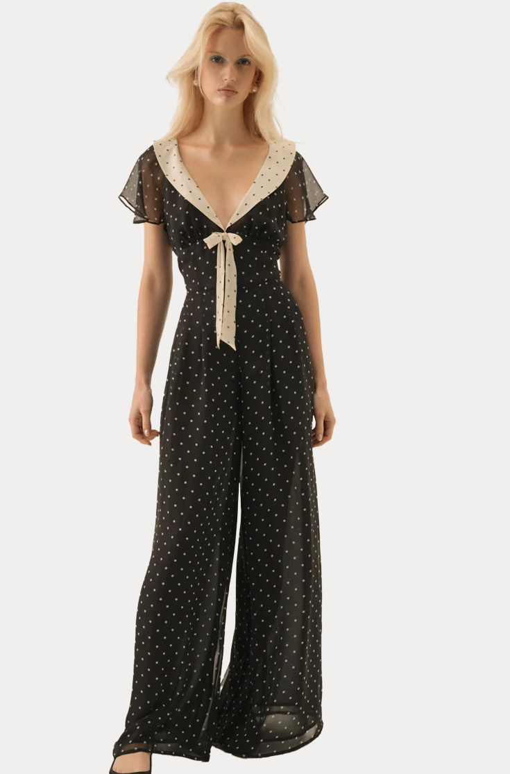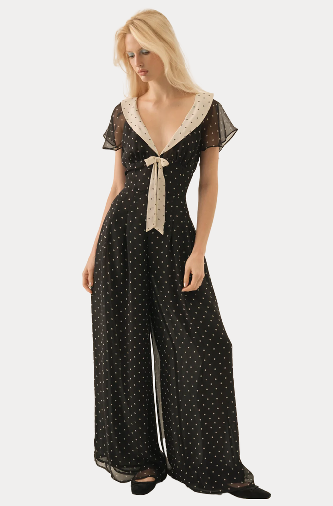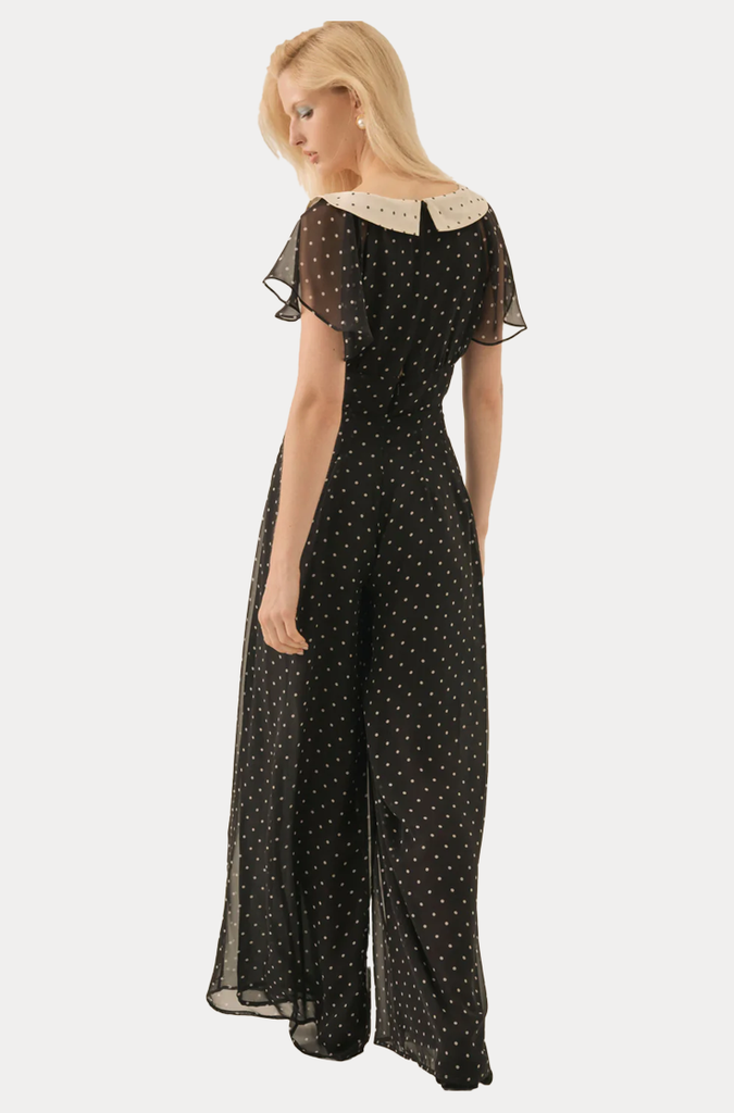 For a fresh take on nostalgic romance, the Dottie Dot black pantsuit exudes vintage charm with its polka dot print and contrast off-the-shoulder sailor collar. This black jumpsuit spotlights flutter sleeves, wide pant legs, and tucks at waist for a classic and sleek look.