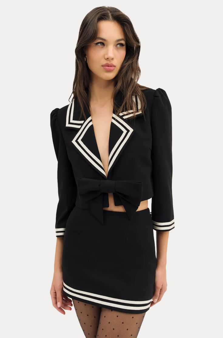 Embrace sailor girl fall with the Josie micro skirt—a high-waisted black mini skirt crafted in a suiting fabric with nautical inspired contrast grosgrain ribbon. Pair this pencil skirt with the Josie Blazer to complete the set.