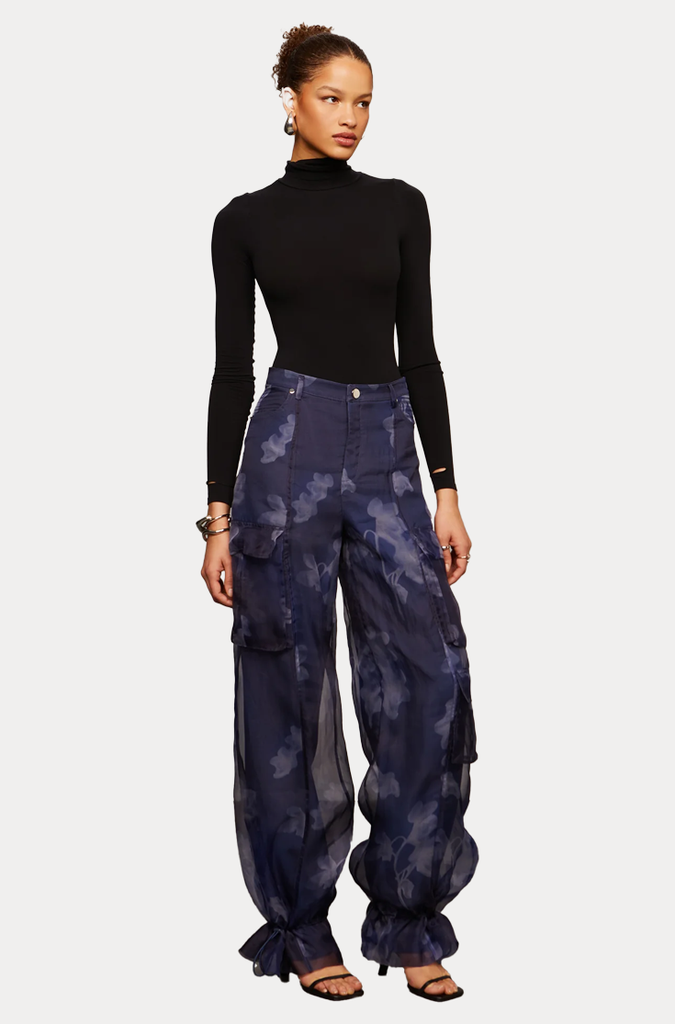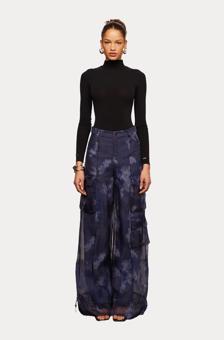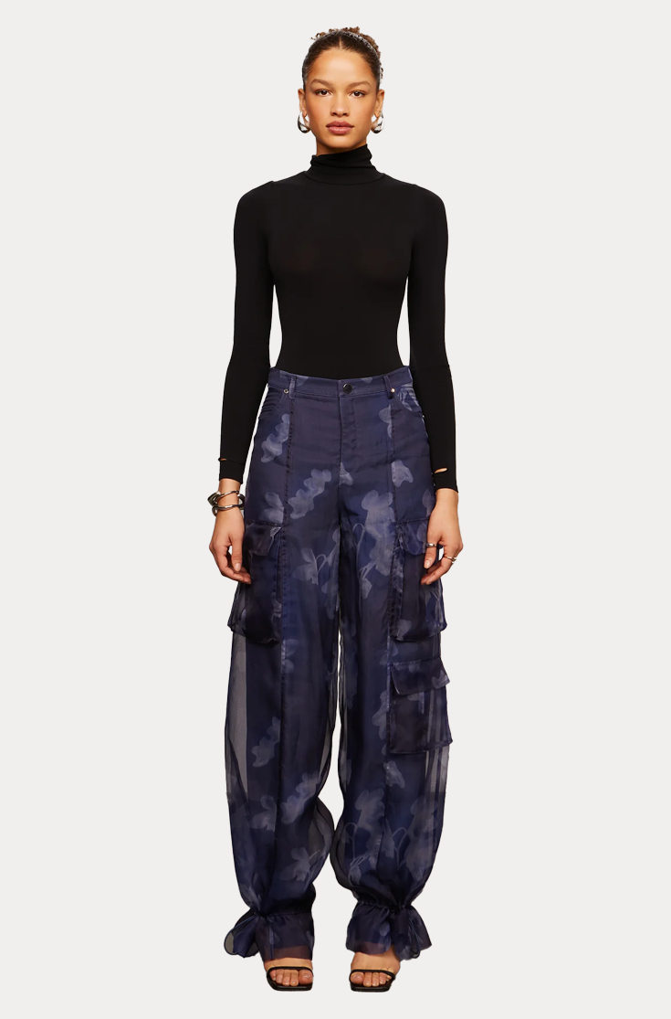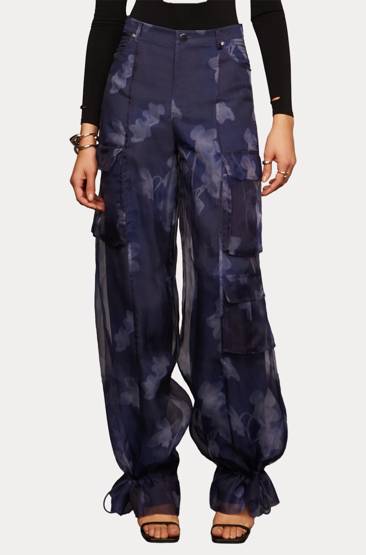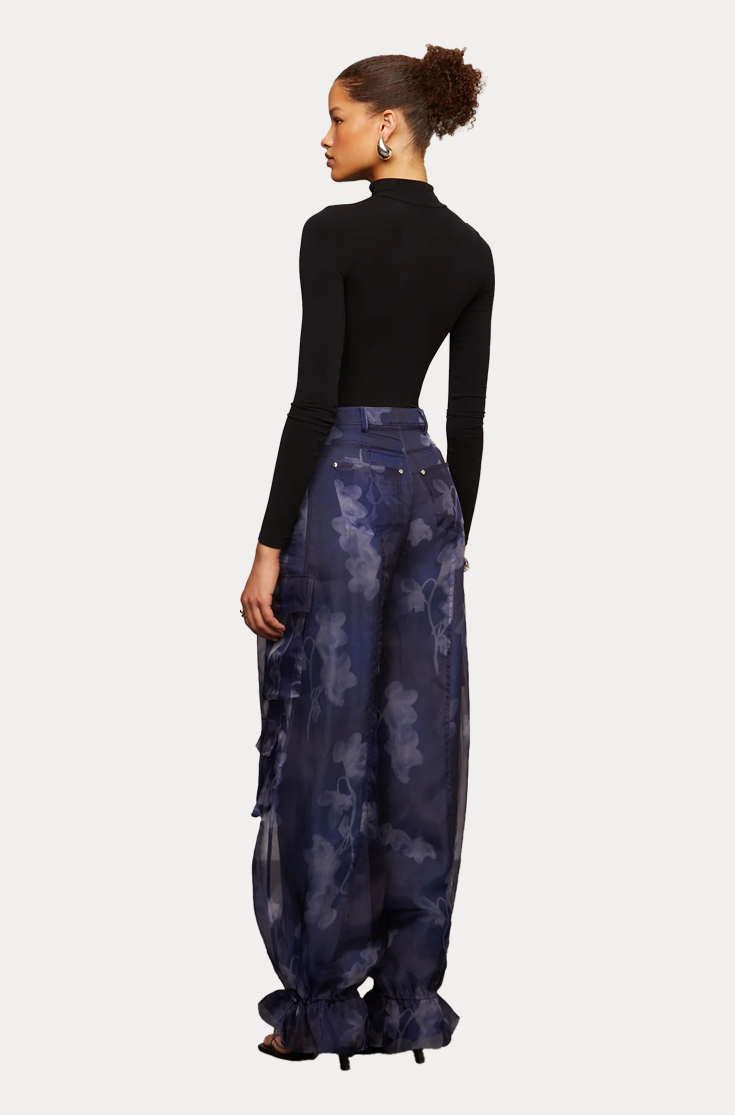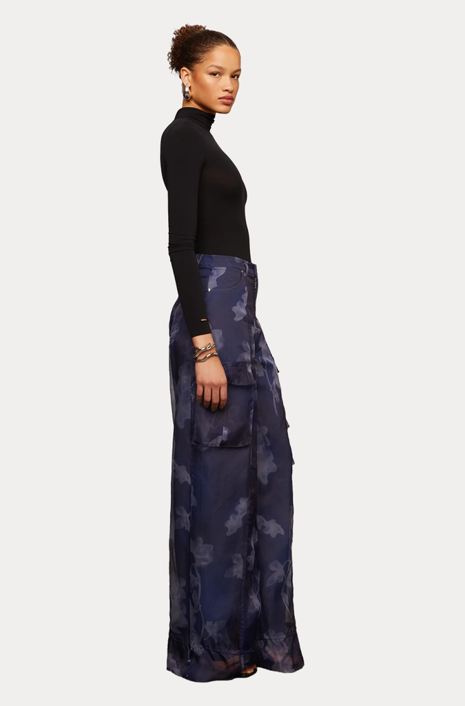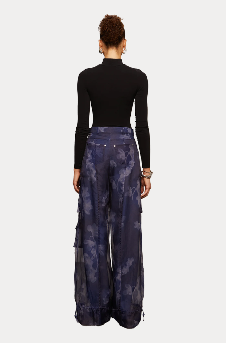 Cut in sheer silk organza and lined in smooth charmeuse, these wide-leg pants float with movement. With topstitched cargo pockets, adjustable drawstring hems, and custom stoppers—it’s utility with a polished twist.