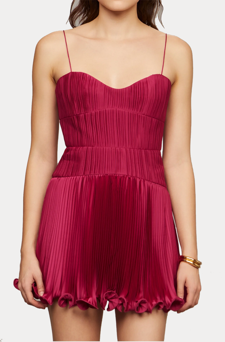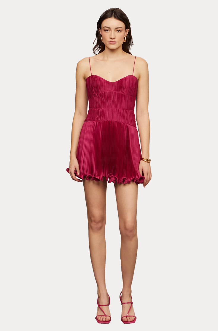 A pleated mini with major AMUR DNA. Featuring a drop waist, bonded micro mushroom pleats, and a flouncy fish-wire hem that brings the bounce. Finished with barely-there straps and a scoop back, because she’s cute like that.