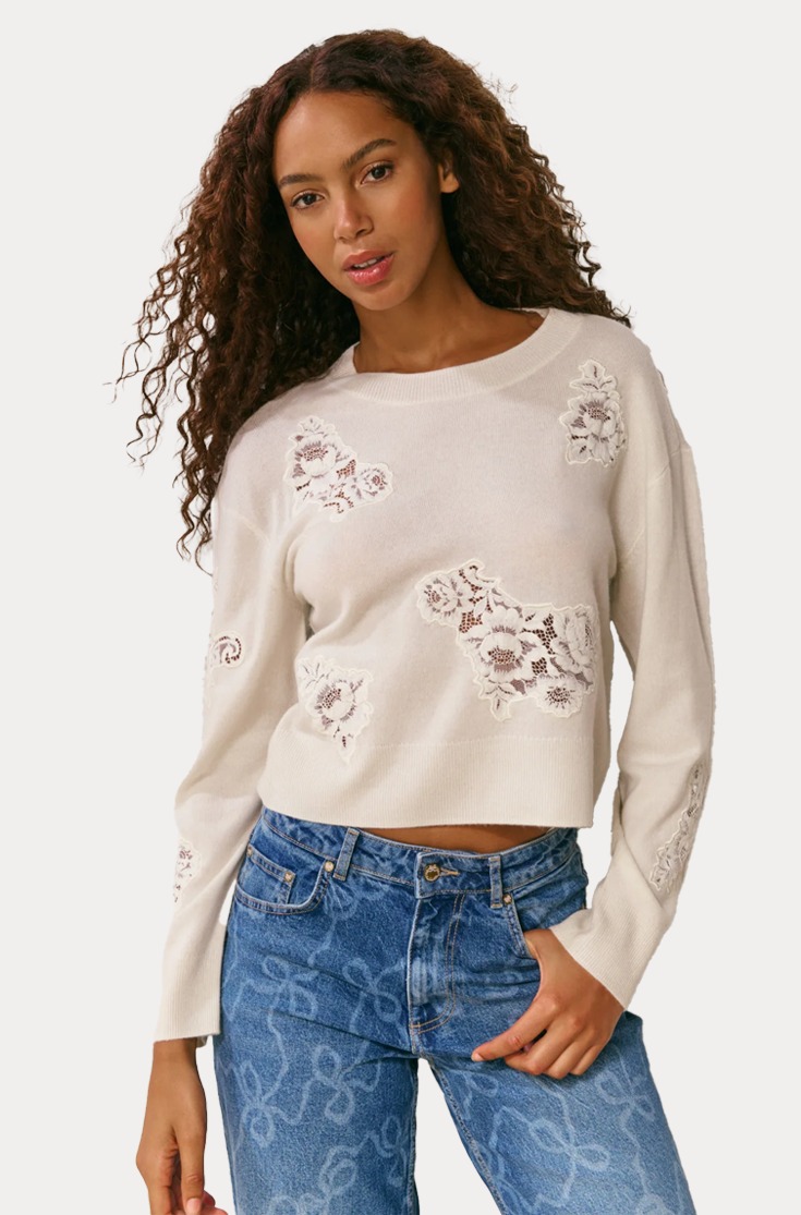 The Lazuli Sweater is a long-line, relaxed pullover crafted in our warm and extra-soft cashmere-wool blend. Featuring inset organic lace shapes throughout the body and sleeves, she offers delicate cutaways that reveal subtle sheerness for a romantic, airy effect. With a longer, less cropped fit than our classic pullover, she layers beautifully over skirts, pants, or dresses, bringing soft texture and timeless charm to any look.