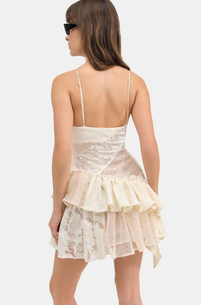 A playful nod to a timeless aesthetic, the Paulina patchwork mini dress charms with its vintage-inspired mixed fabric panels. This cream mini dress is adorned with mixed lace and loop trims and finished with an asymmetrical layered skirt.