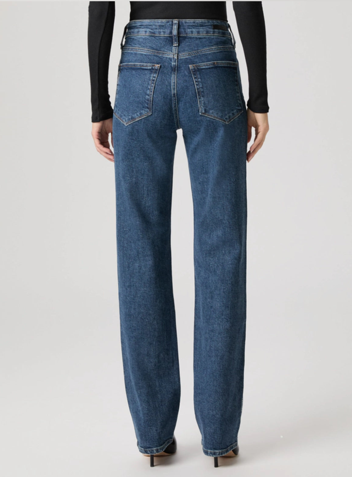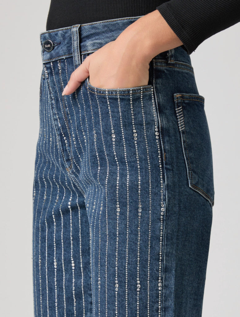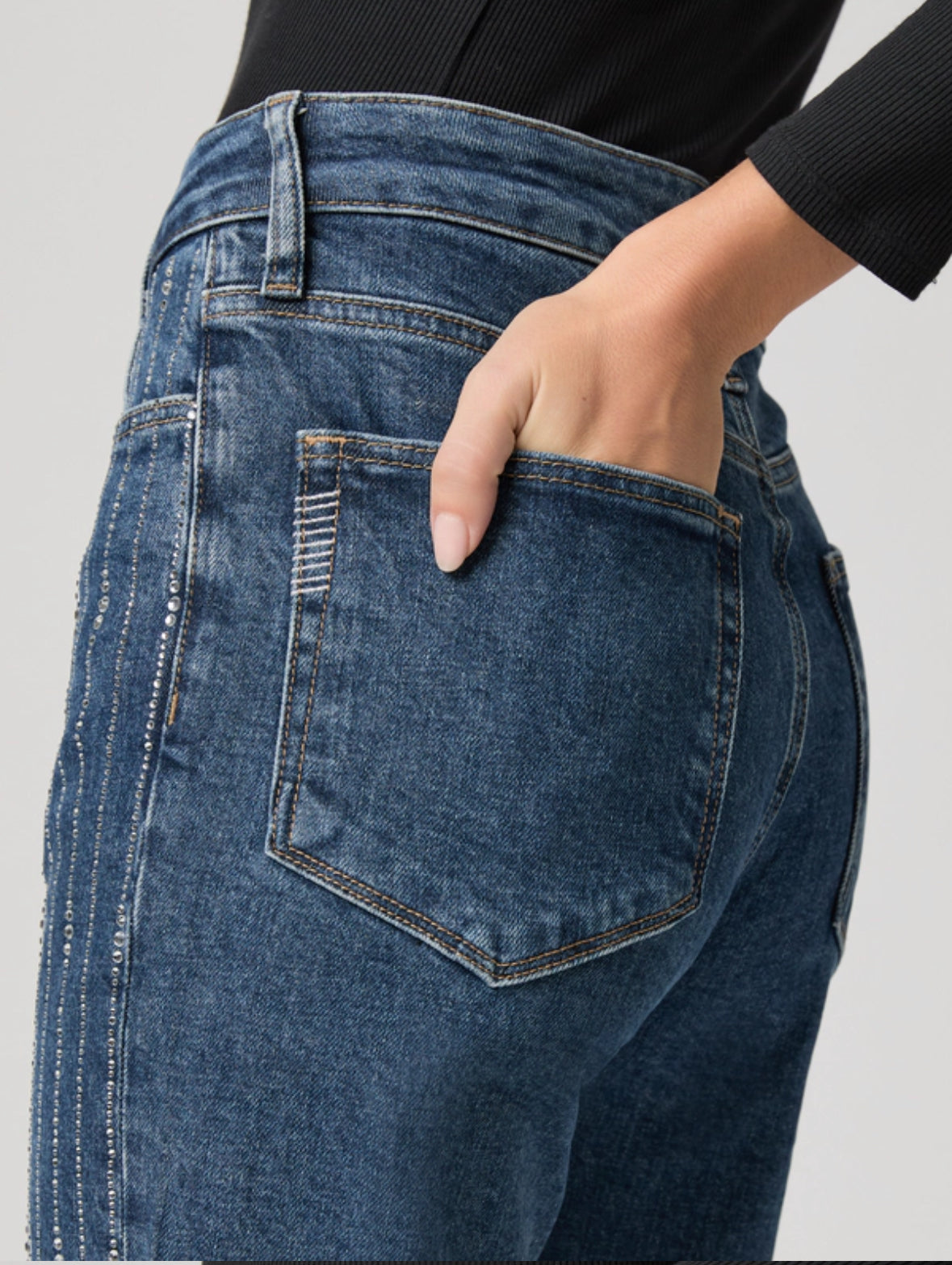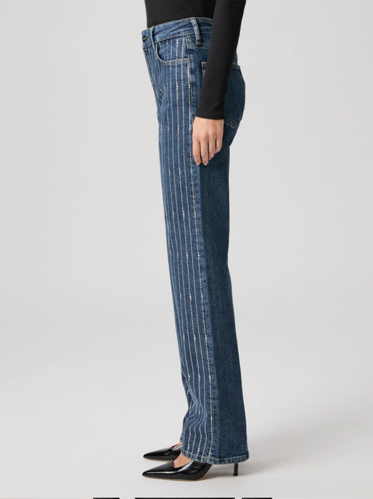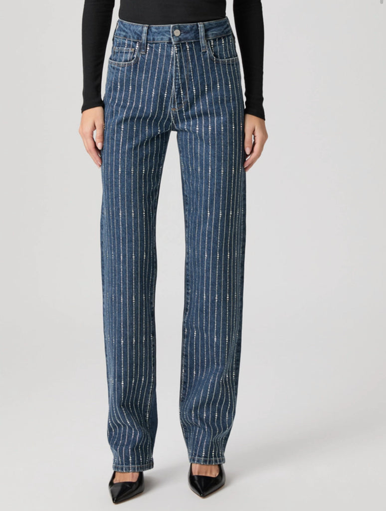 A standout take on a classic high-rise straight leg. In a versatile medium wash, elevated with vertical pinstripe gradient rhinestones that sparkle down the front, this pair is crafted from heritage-inspired denim with a soft hand-feel and a hint of stretch.