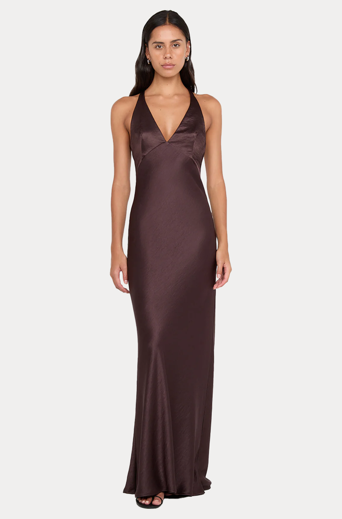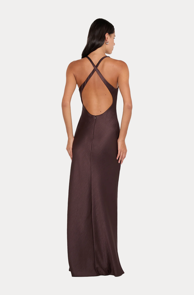 The BEC + BRIDGE Dreamer V Neck Dress in Dark Chocolate is an effortless maxi dress, perfect for your next formal event. Delicately cut on the bias, the dress features a V neckline with an underbust seamline and bust darts, while the shoulder straps crossover at the back to create an open-back detail.