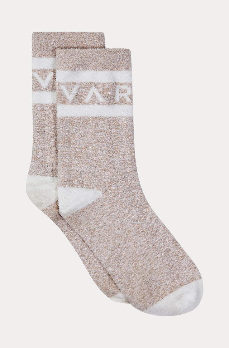 Woven in a bouclé-effect yarn, the Spencer Marl socks feature a Marl effect, a classic Varley logo stripe, and contrast heel and toe.