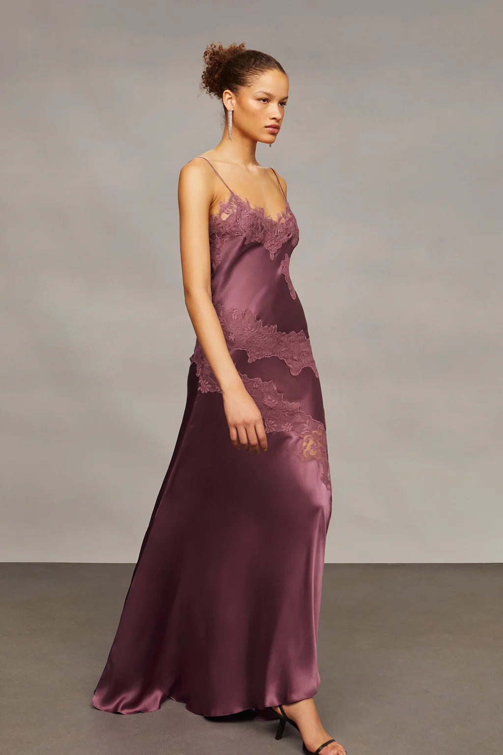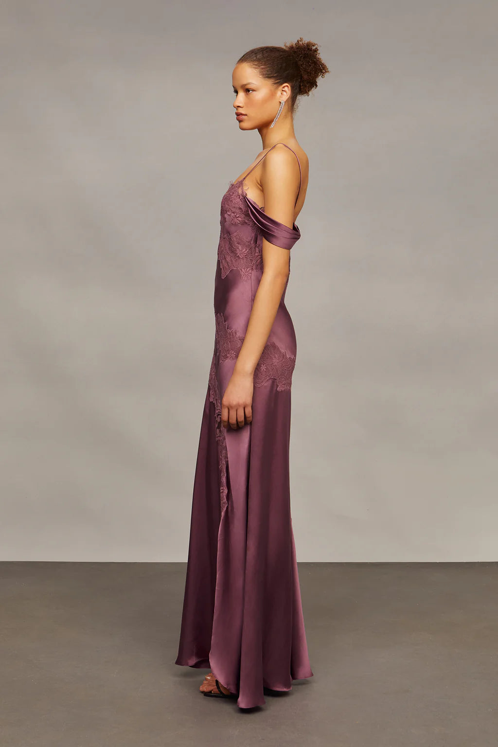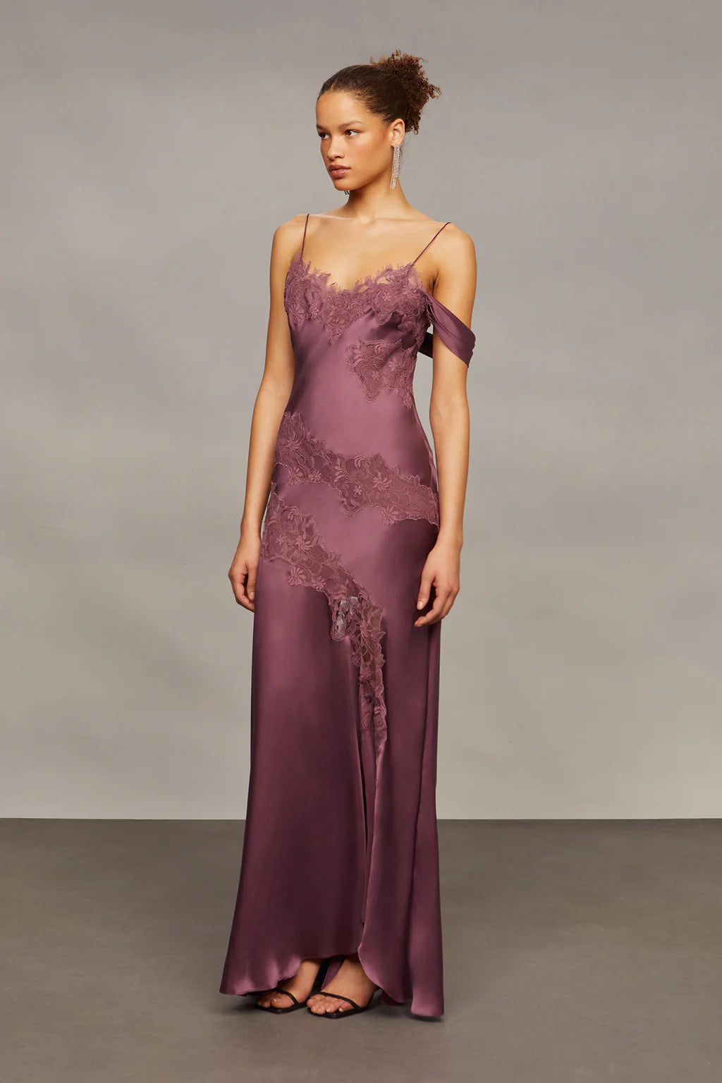 Crafted in 100% silk, this off-shoulder satin gown glides along the body with hand-placed lace appliqué in soft, cascading curves. With a sheer slit and barely-there straps, it’s your sultry take on balletcore.