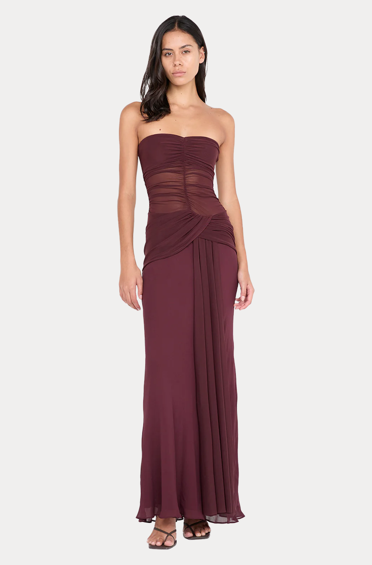 The BEC + BRIDGE Noemi Strapless Dress in Plum features a sheer mesh bodice with ruched detailing and a twisted drape detail, creating a visually impactful design while maintaining elegance — perfect for any formal occasion.