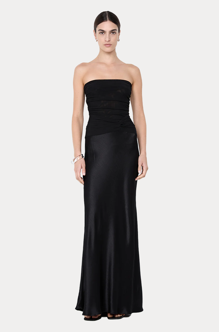 Millah Strapless Dress in Black. This stunning strapless maxi dress combines a soft mesh bodice with a slinky bias-cut skirt, featuring a unique twist detail, perfect for a glamorous night out or an elevated evening event.