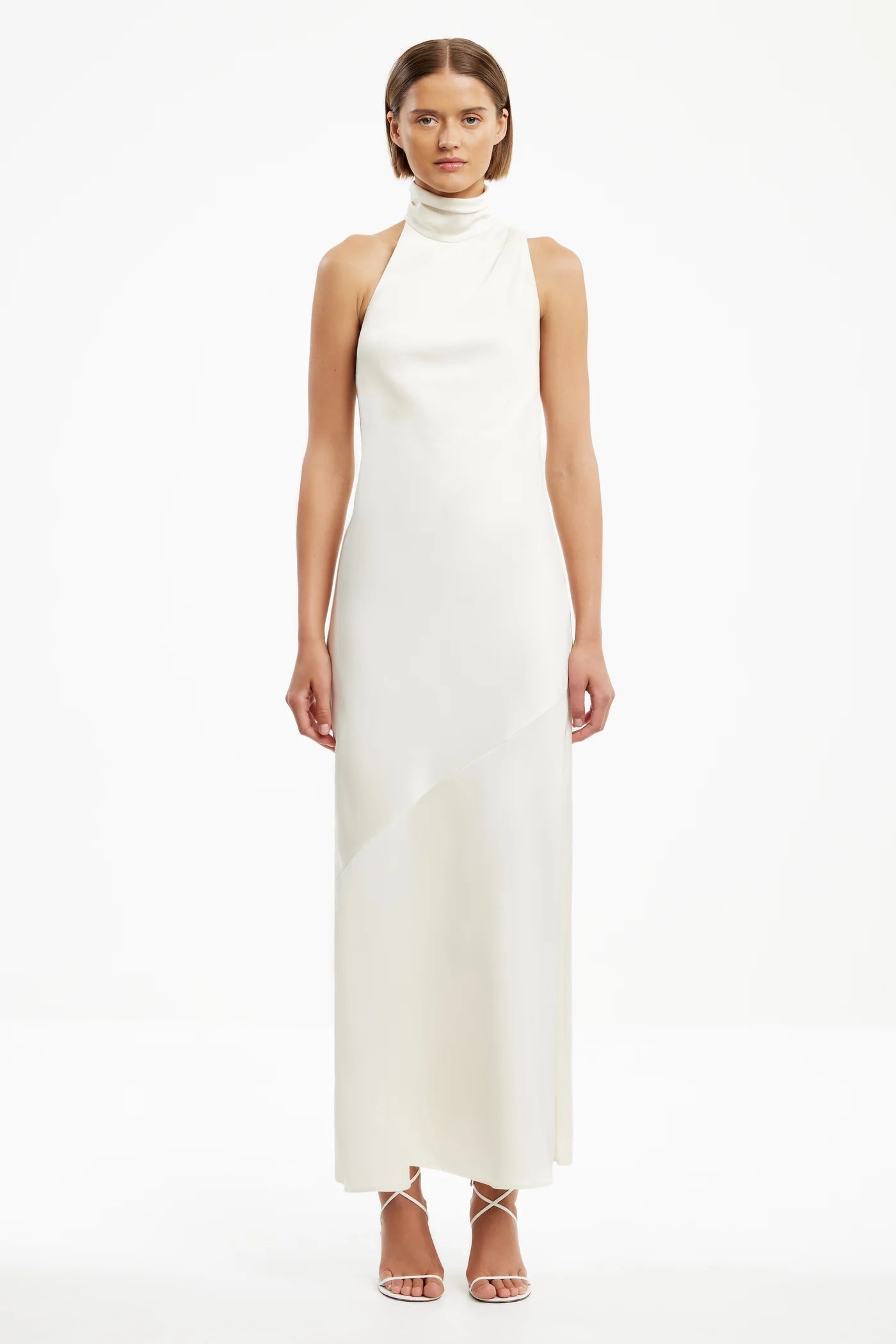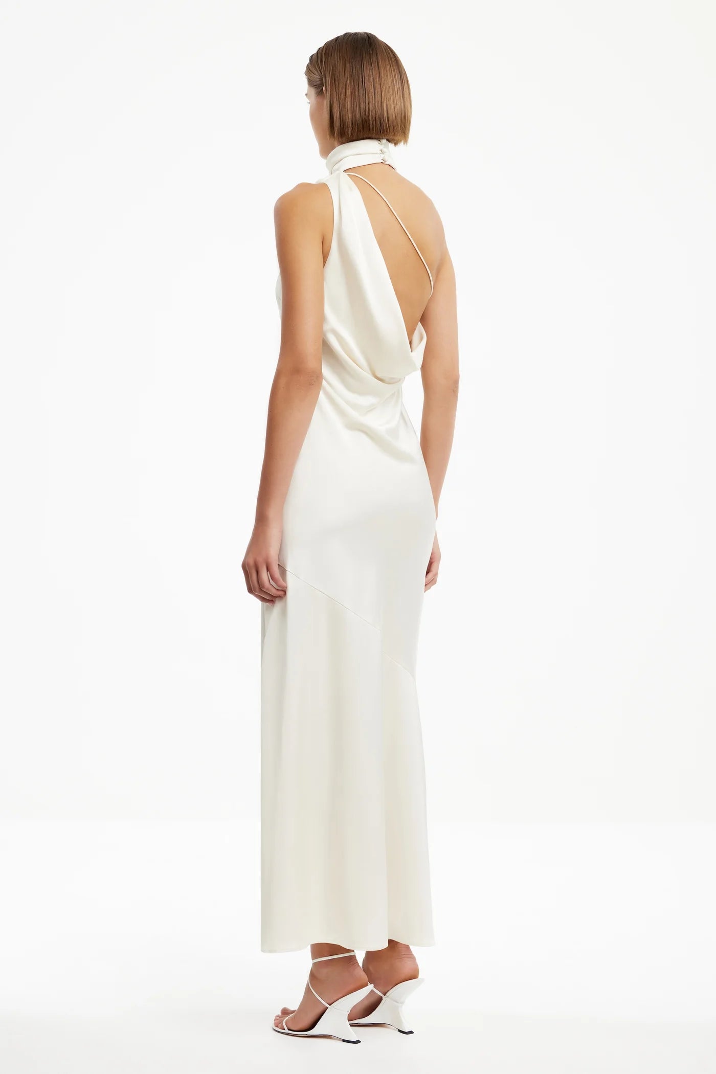 Sleek and sophisticated, the Nadia Dress in Ecru is cut on the bias for a fluid, body-skimming fit. The high neckline is balanced by a dramatic asymmetrical cowl back, secured with a delicate rouleau strap. A triple button closure adds detail at the nape, making this piece ideal for black-tie events or elevated evening occasions.