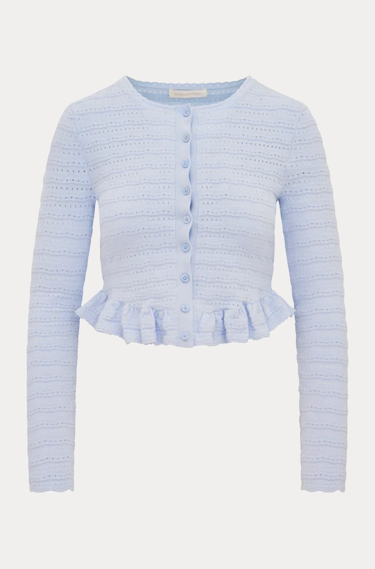 Add a layer of love with the Rogan Cardigan. This lightweight knit stuns featuring an intricate stretch pointelle with small scallop textures throughout. With a feminine and slim silhouette, the cardigan is adorned with playful ruffles at the peplum hem. This sweater is finished with custom faux shell bow buttons down the center front. Wear over your favorite mini for a full look.