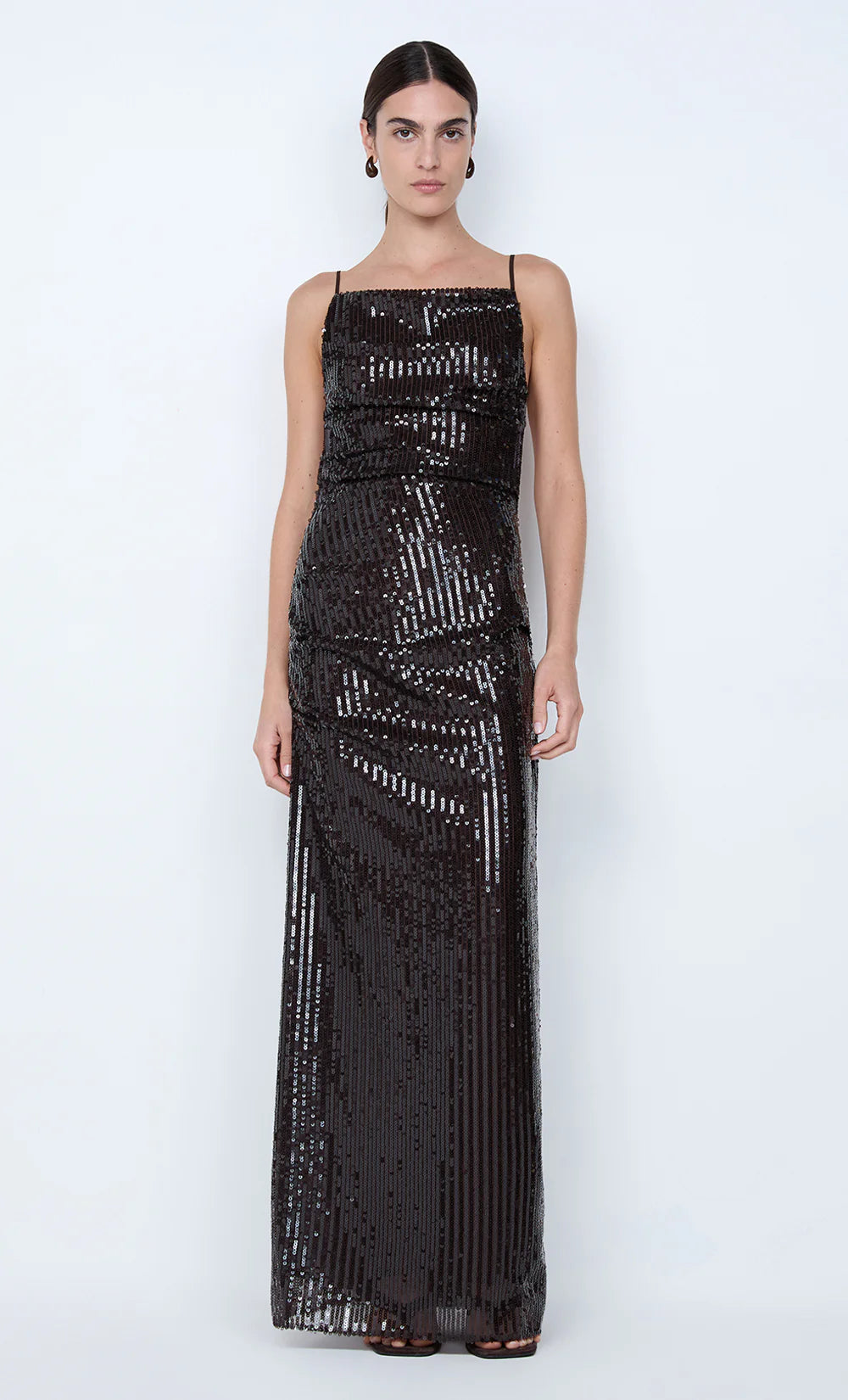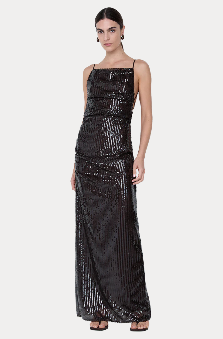 This sequin backless maxi dress, features a high boat neckline and an open back with delicate self-ties, creating a dazzling column silhouette perfect for a glamorous evening event or a chic night out.