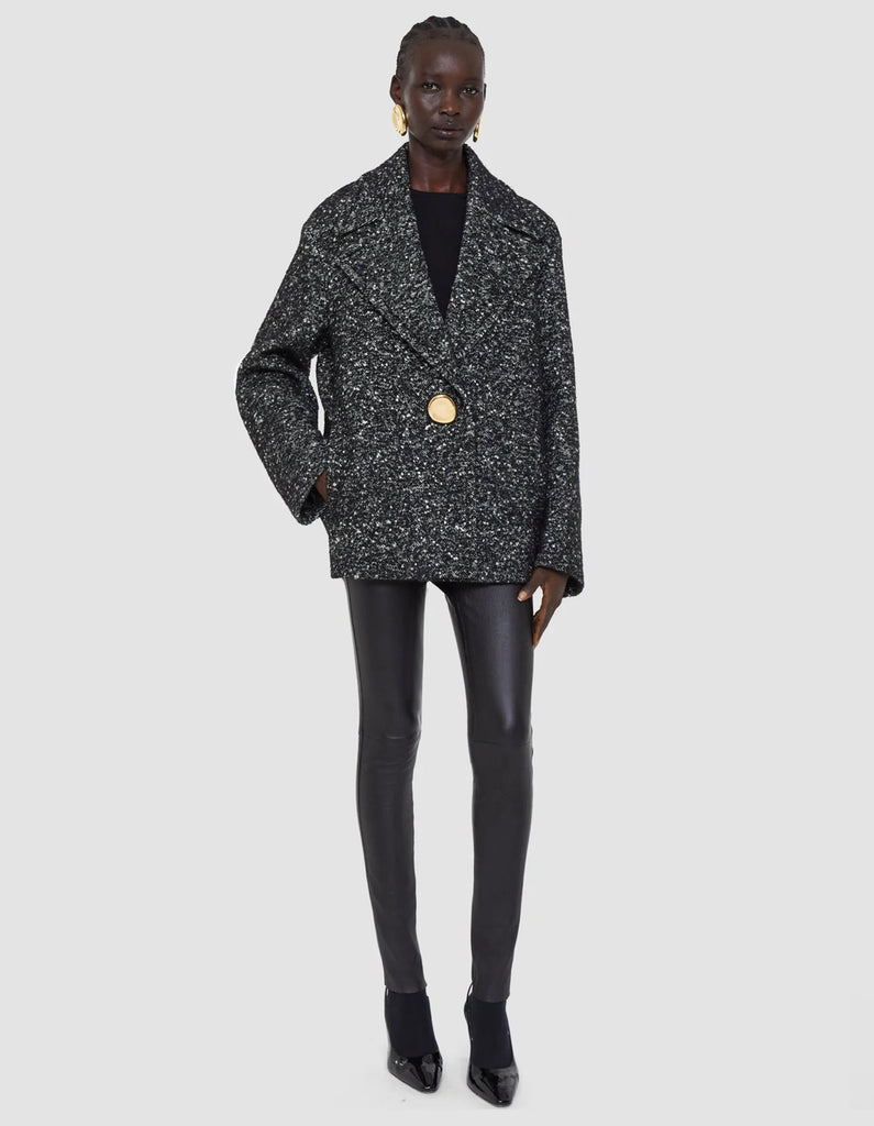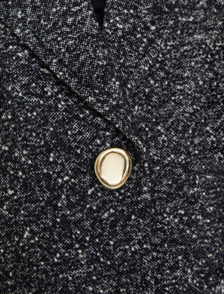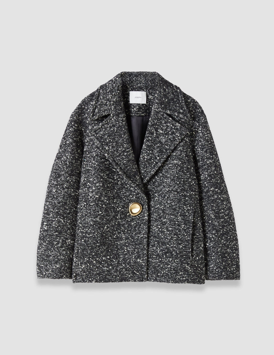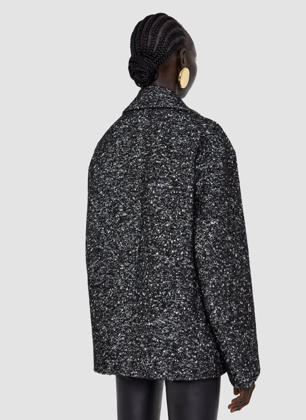 The Agar Donegal Tweed Wool Coat is a relaxed fit style, crafted from a warm, luxurious blend of soft virgin wool and mohair. Designed with a cocoon silhouette, it’s defined by its black and ivory speckled Donegal tweed texture, statement collar, and gold-tone bean button.