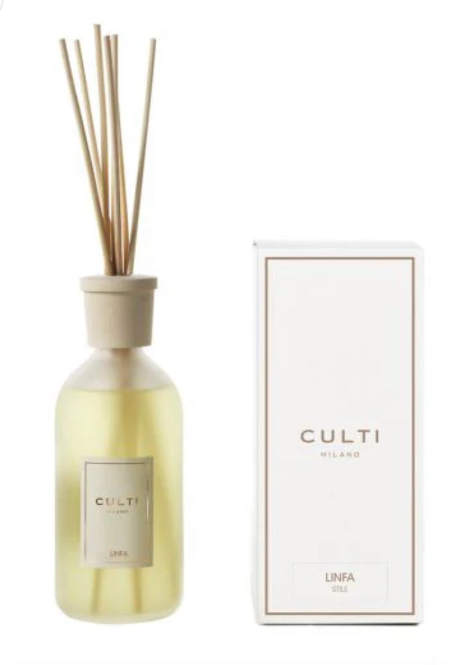 Frosted glass bottles with ivory-coloured labels and cap in natural maple wood. The aesthetic character of the CULTI STILE line evokes purity and elegance. Linfa: Rediscovering oneself while strolling through woodland, that slopes down to the sea. A stimulating blend of subtlety and potency, from tiny lustrous berries and white blossoms, to the serene majesty of the sea and mountains.