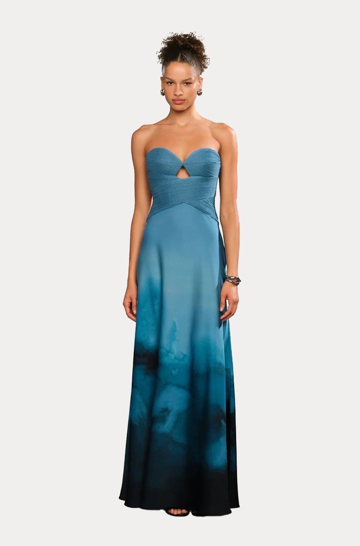 This strapless gown flows in soft charmeuse with a ruched twist bodice and keyhole cutout. The skirt fades into a moody dip-dye—like she waded in too deep and didn’t mind.