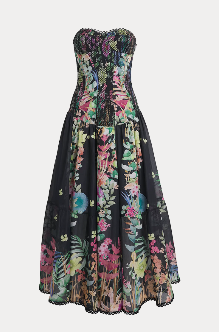 Immerse yourself in the luxury and sophistication of the ILLYR dress—a long silhouette that balances structure and flow with exquisite delicacy. Crafted in printed cotton voile, it features a corset-style fitted bodice shaped with elasticized paneling for a close, flattering fit. A lace-trim sweetheart neckline lends irresistible femininity.