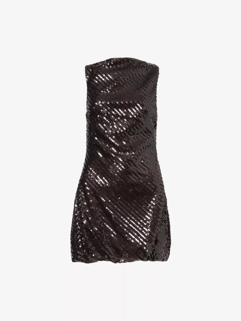 Romilly Mini Dress in Dark Chocolate. This stunning sequin mini dress, with its high boat neckline and a fitted silhouette that flows into a twist bubble skirt, is perfect for a glamorous night out or a chic evening event.