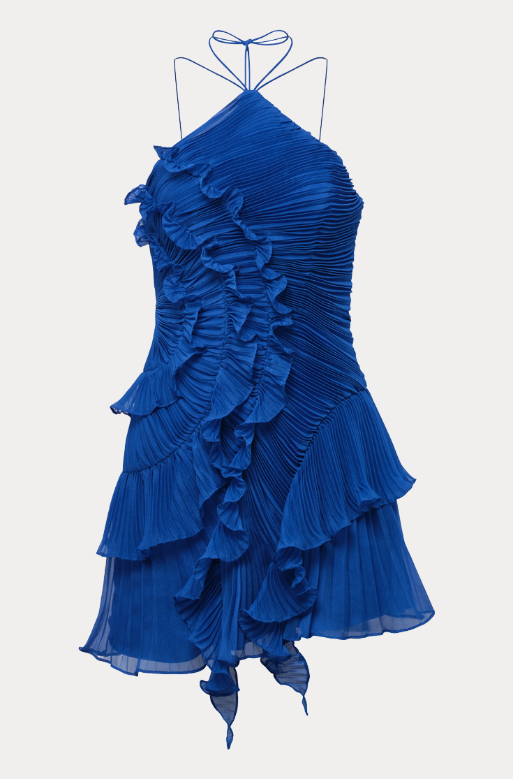 This mini take on our bestselling Lorelie gown features sculptural pleating and fluttering ruffles throughout. Finished with an asymmetric hem and halter neckline for a flirty, high-energy finish.