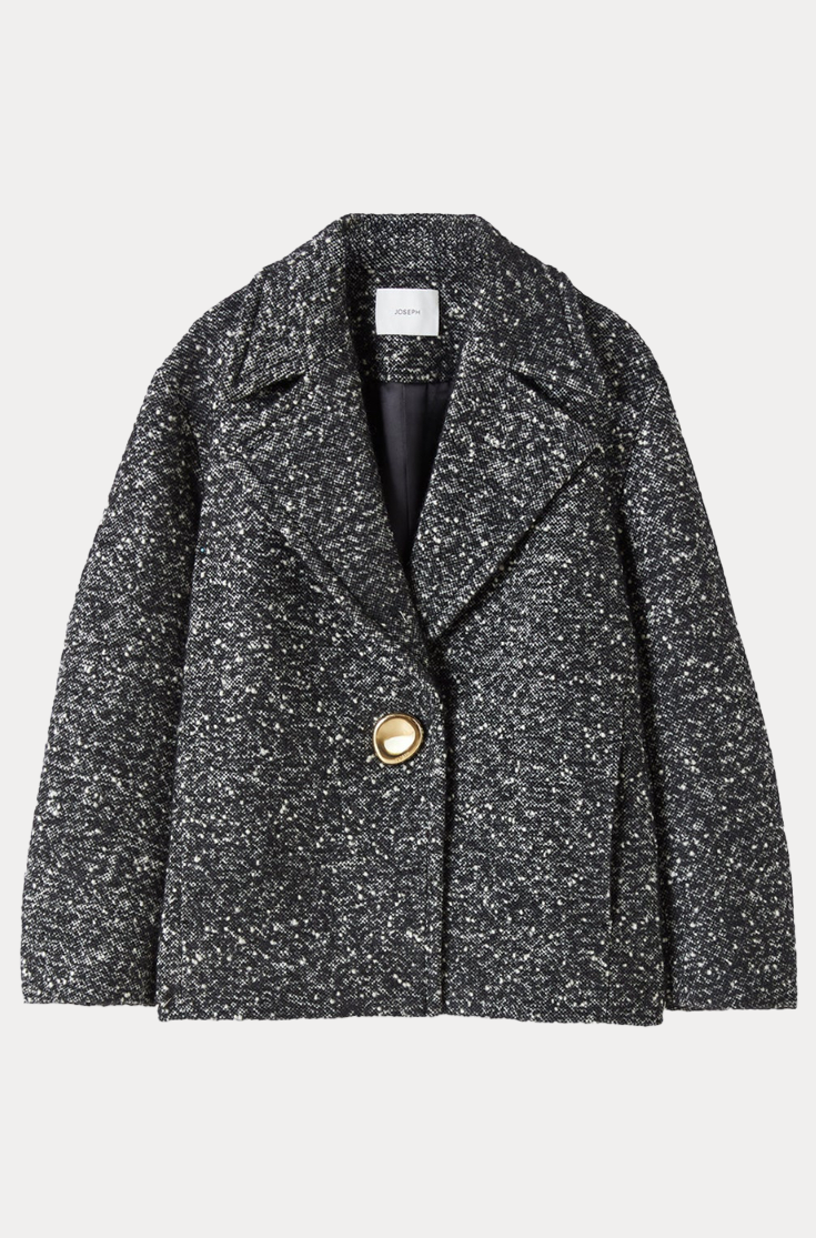 The Agar Donegal Tweed Wool Coat is a relaxed fit style, crafted from a warm, luxurious blend of soft virgin wool and mohair. Designed with a cocoon silhouette, it’s defined by its black and ivory speckled Donegal tweed texture, statement collar, and gold-tone bean button.
