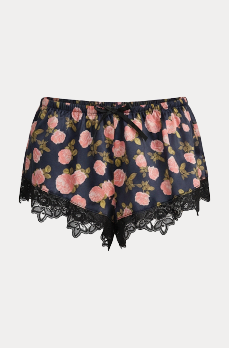 Blur the line between lingerie and everyday dressing with the Kayla sleep short—satin shorts rendered in a romantic navy rose print and adorned with lace trims and satin ribbon bow at front waist. Pair it with the kayla sleep for the full satin pajama set.