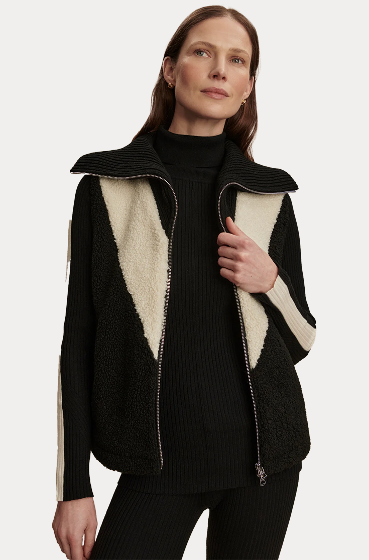 The Caspian is crafted from our Soft Bouclé Sherpa with a bold contrast V-panel, perfect for layering over your favorite knits and sweats. It's accentuated with a knitted oversized collar, a cotton-rib back hem, and trimmed pockets, adding extra warmth and comfort.