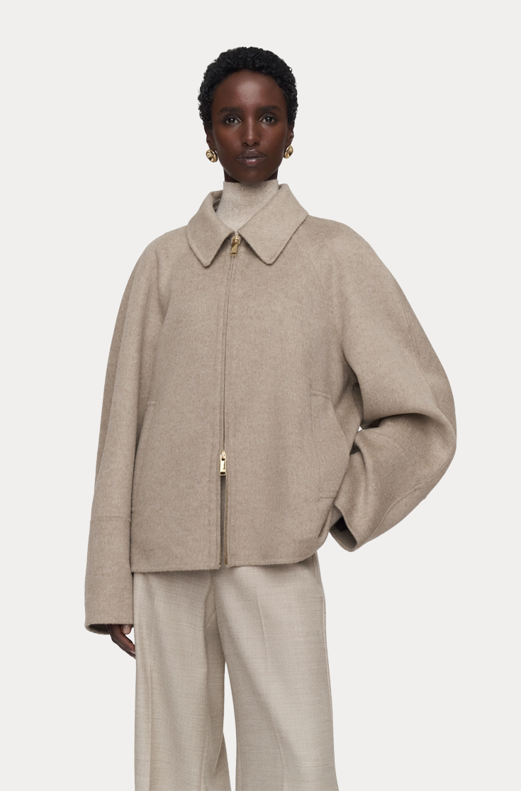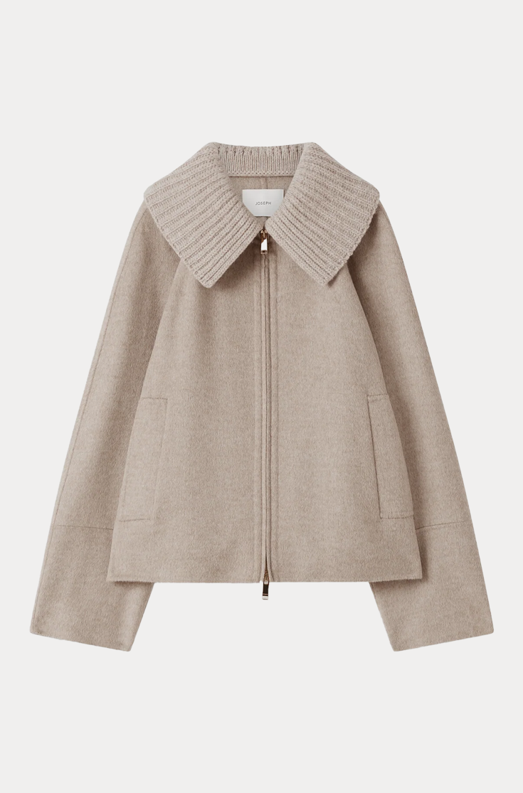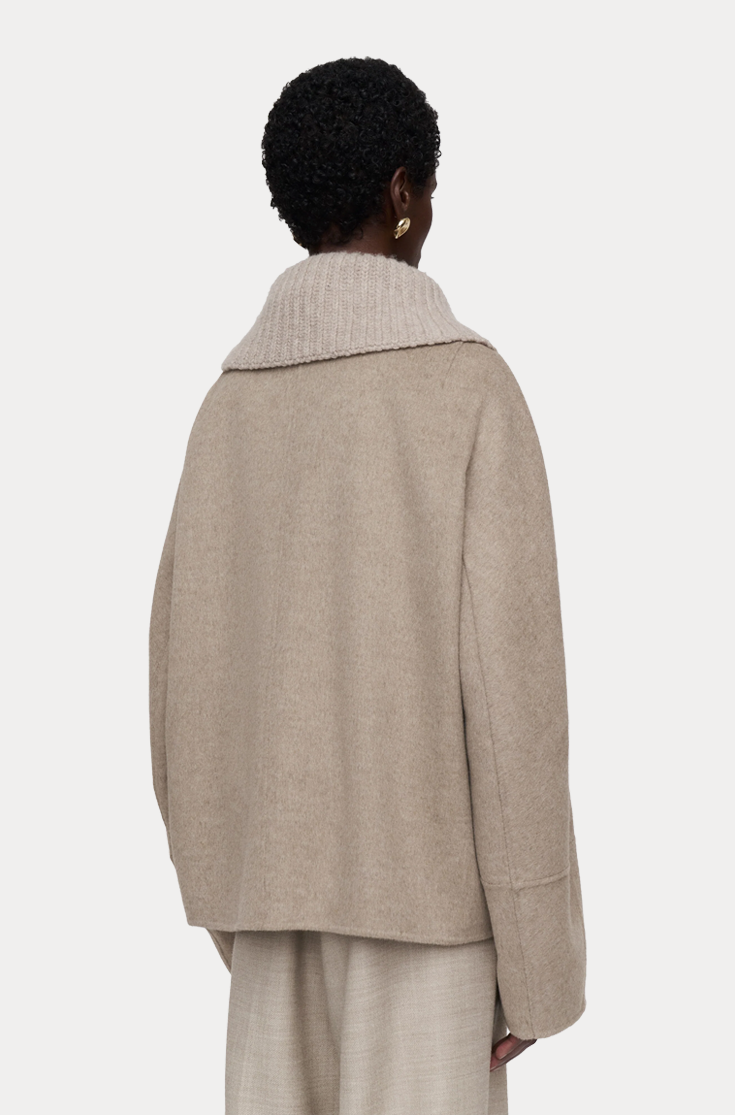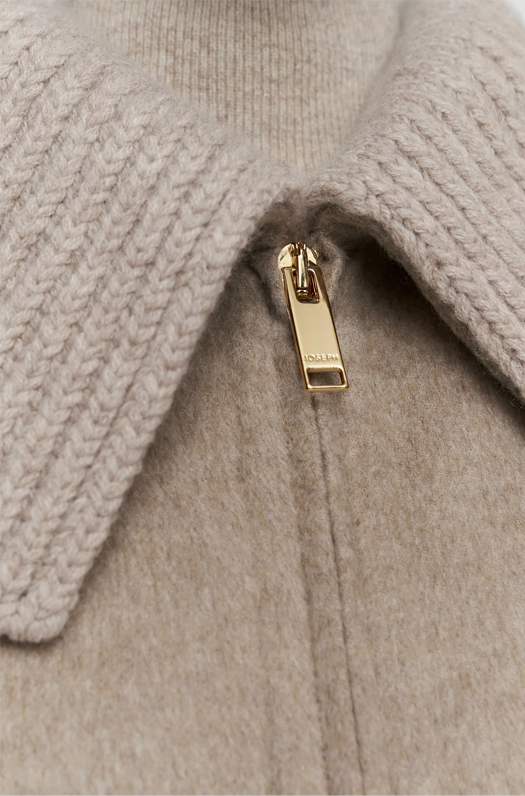 The Cooksey Double Face Cashmere Jacket is a relaxed fit, zipped jacket, crafted from a luxurious blend of wool and cashmere. This modern silhouette features soft, sculptural shaping across the back and sleeves. Elegantly finished with a double-ended zip and a detachable knitted collar for versatile styling.
