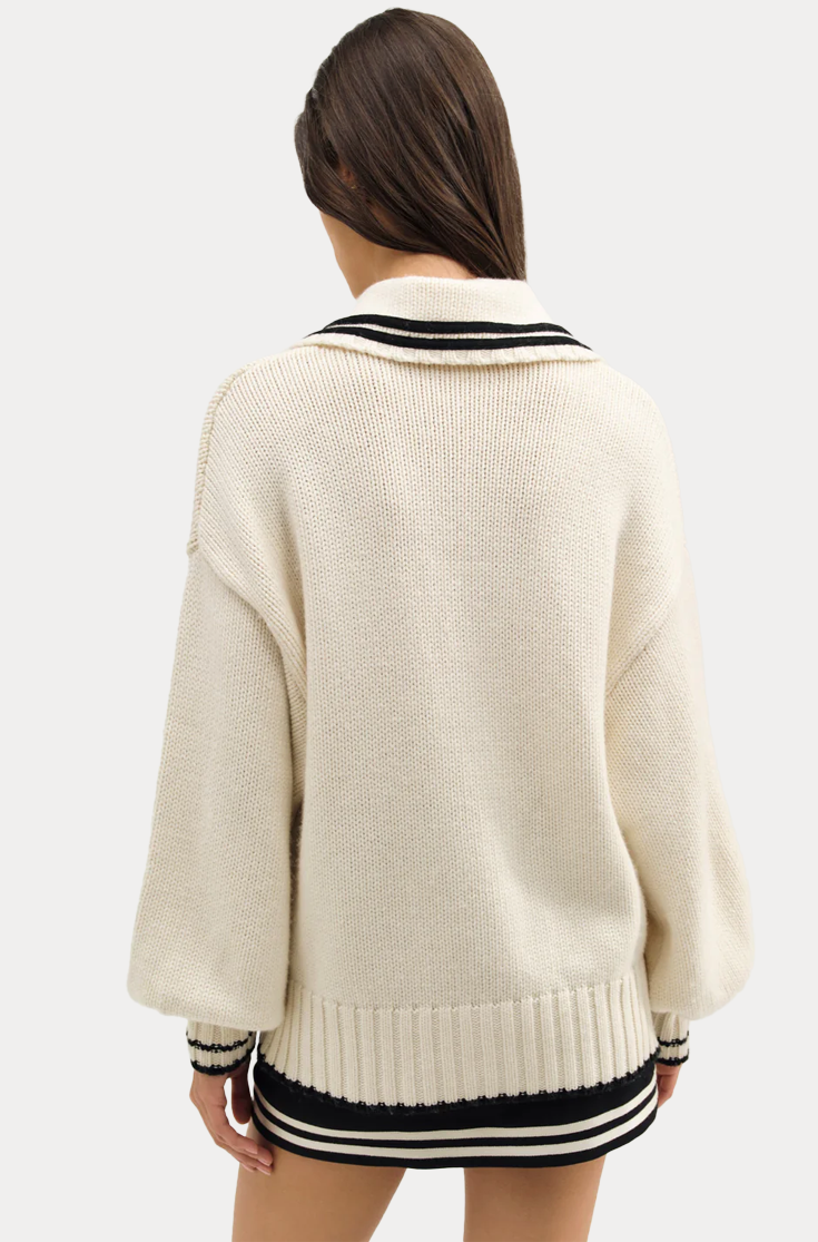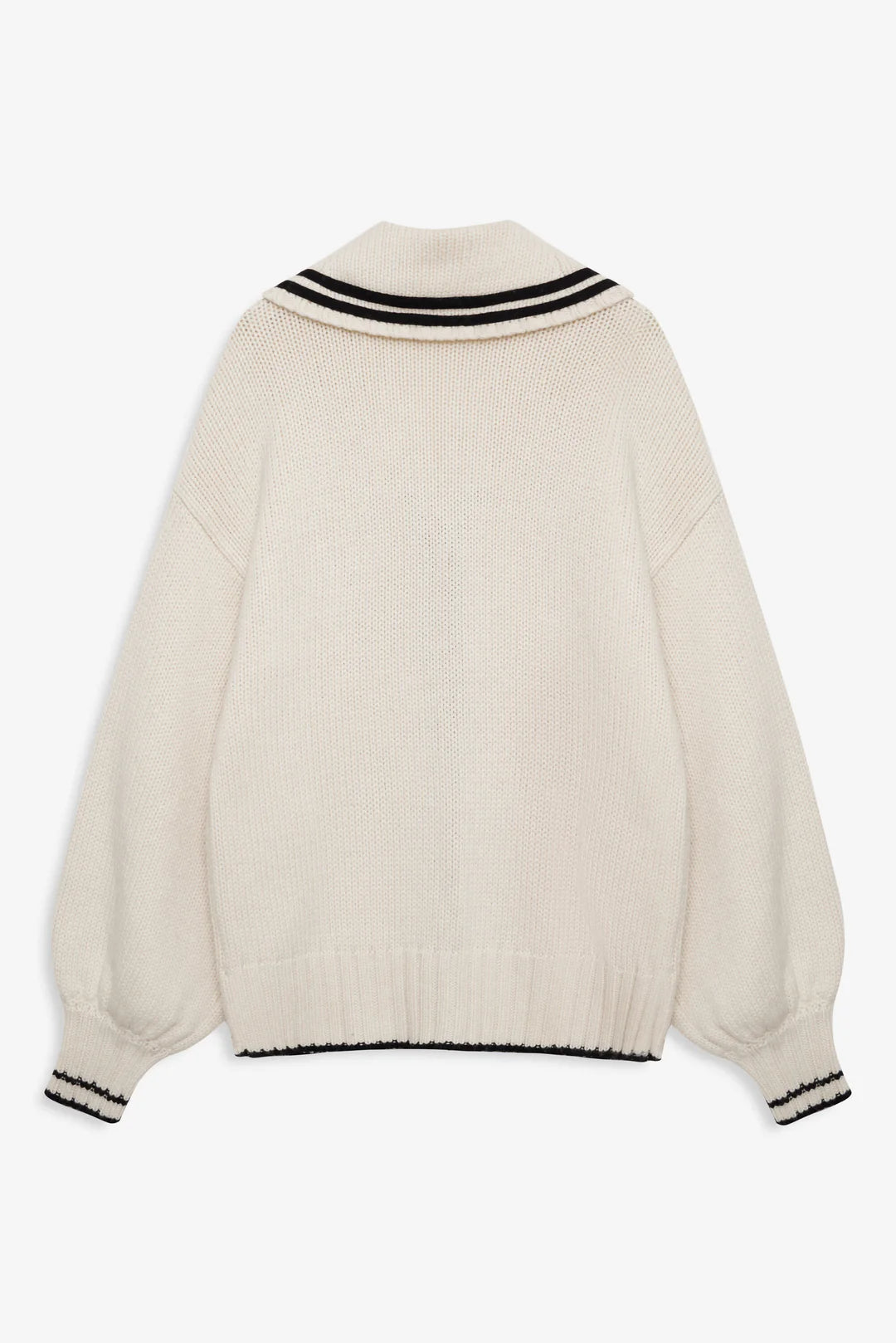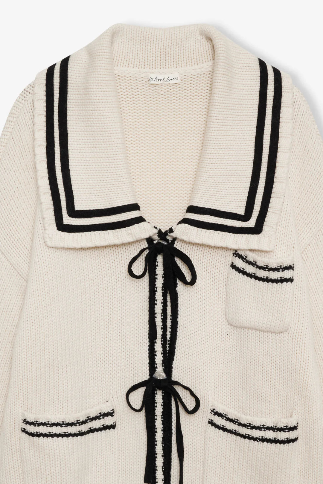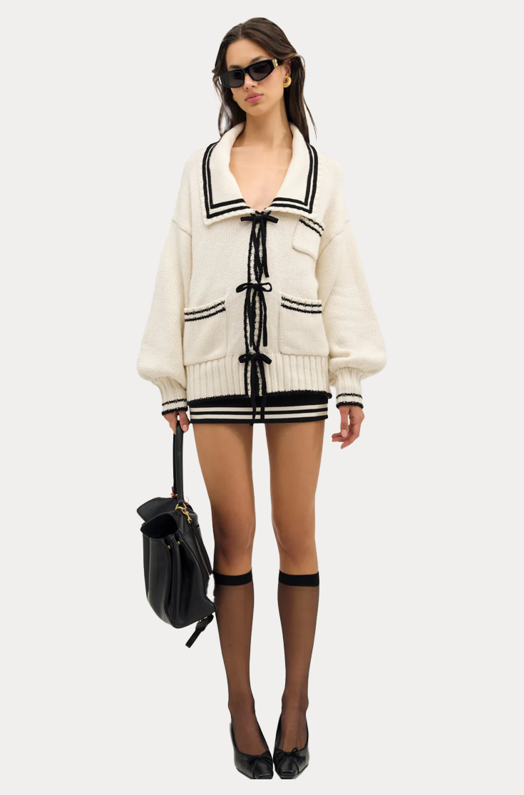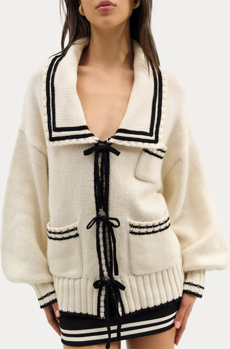 A soft and feminine spin on the sailor aesthetic, the Marina oversized cardigan is adorned with contrast knitted stripes, a classic square sailor collar, and patch pockets.