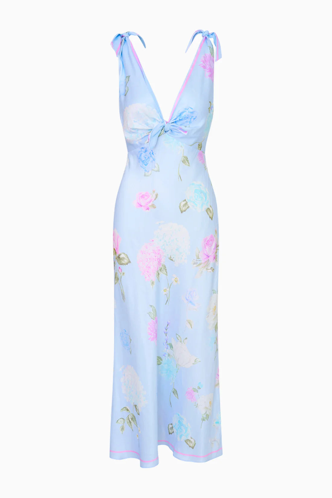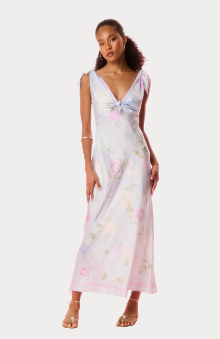 Put on the pretty with the Perri Dress. This stunning midi dress debuts with an Italian-inspired print featuring hand-painted flowers in a romantic arrangement. With a scarf-inspired silhouette, this piece begins with a deep v-neckline above a scarf-like top that ties at the shoulders and at the front. The body-skimming dress falls to a bias skirt.