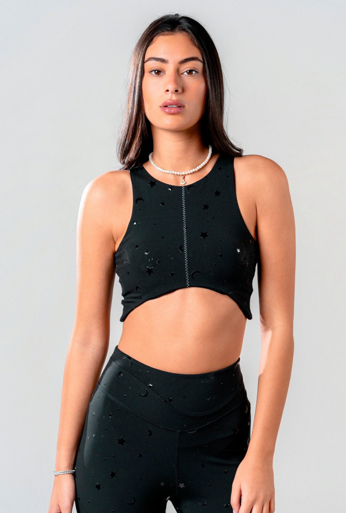 Illuminate every move with the Starglaze Bratop , a piece where functionality meets cosmic artistry. Crafted from sculpting, moisture-wicking fabric, this high-support bratop is designed to move with you through every stretch and stride. Its sleek black base is adorned with a constellation of 3D silicone stars and crescent moons, catching the light with every motion for a subtly radiant effect.