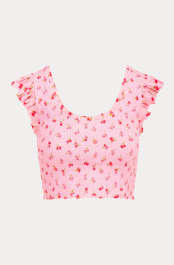 Introducing the Dovi Top. This top features flattering smocking throughout the body, gently cinching for a defined silhouette. Delicate ruffles adorn the neckline and sleeves, adding a touch of romance and whimsy. Designed with a shorter fit, the pretty top features our new ditsy rose print all over.