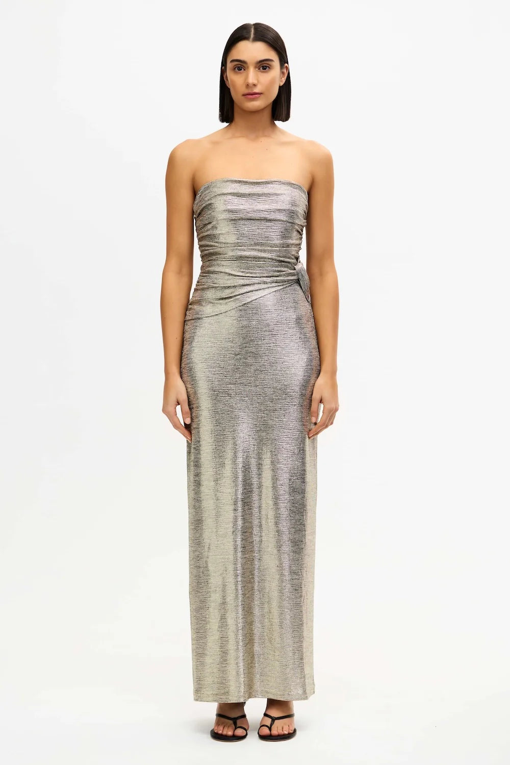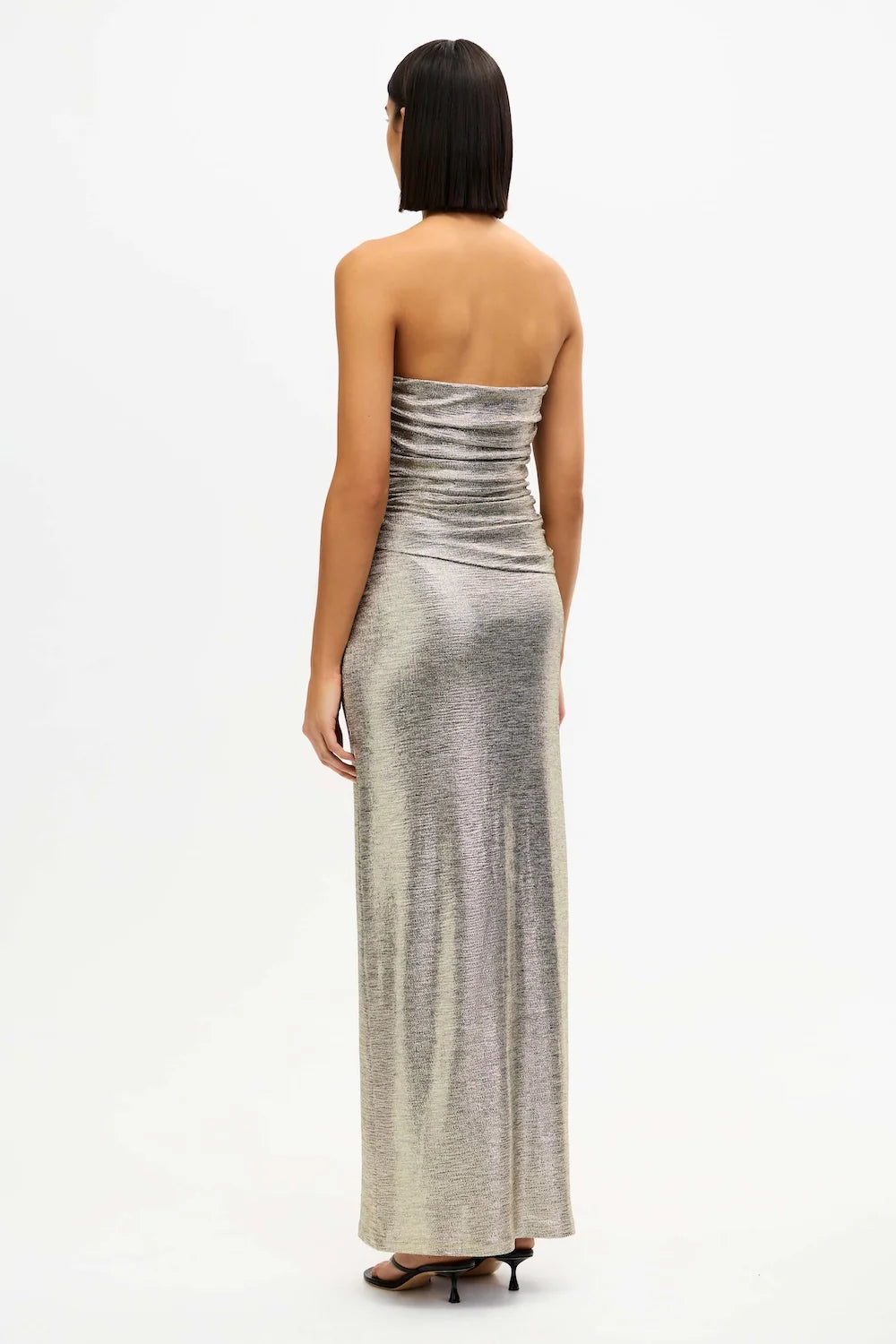Radiating modern sophistication, the Caera Maxi Dress in Golden Hour is a reimagining of evening elegance. Sculpted in a gold foil jersey, this full-length dress showcases gathered detailing through the bodice for a defined, flattering shape. Fully lined and opaque, the dress is finished with an invisible side zip‚ ideal for event dressing with a contemporary edge.
