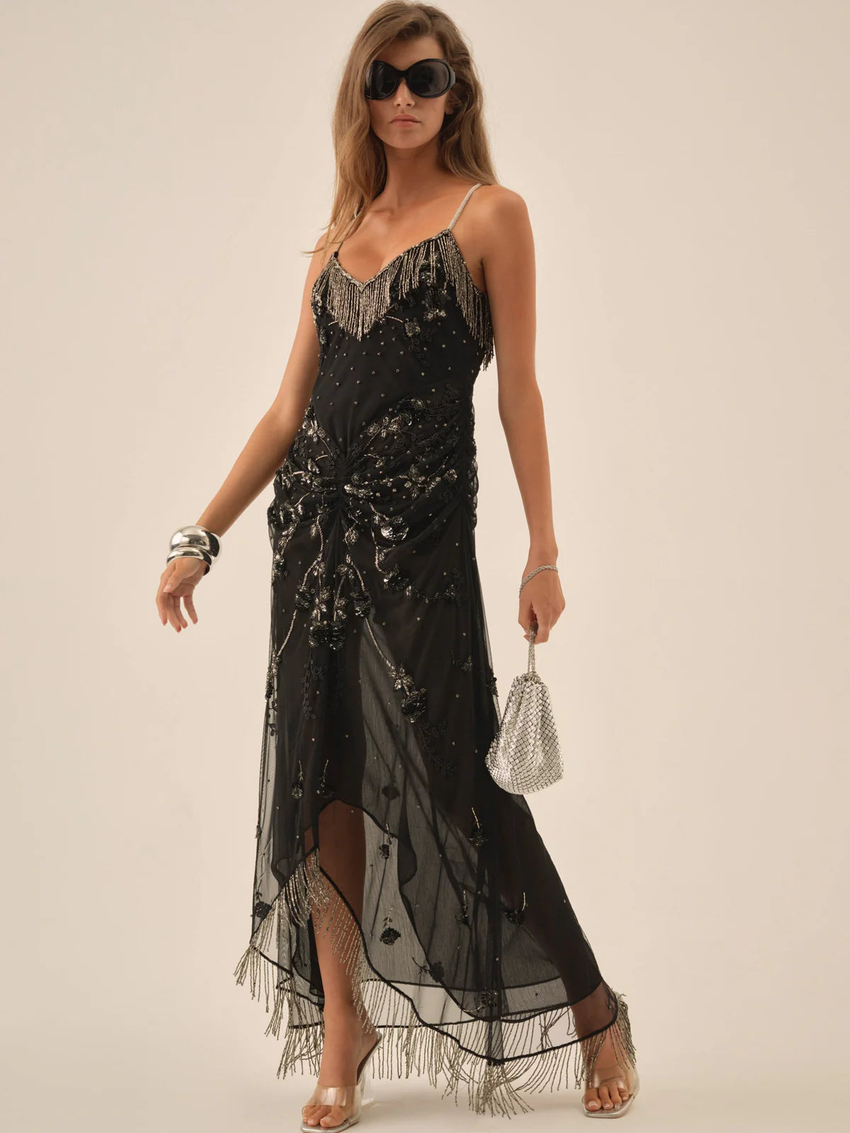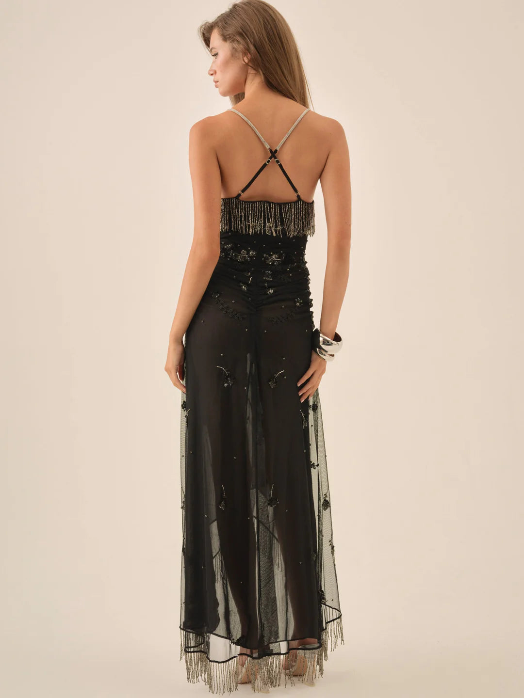 FL&L Keepsakes: The Cher black maxi dress captures the spirit of the season's most decadent soirées in sheer black chiffon, trimmed with cascading rhinestone fringe detailing. This statement black gown features a scalloped neckline and a fluid hi-low hem which shimmers with every step. Embellished with exquisite beading, this cocktail dress shows off expert craftsmanship.