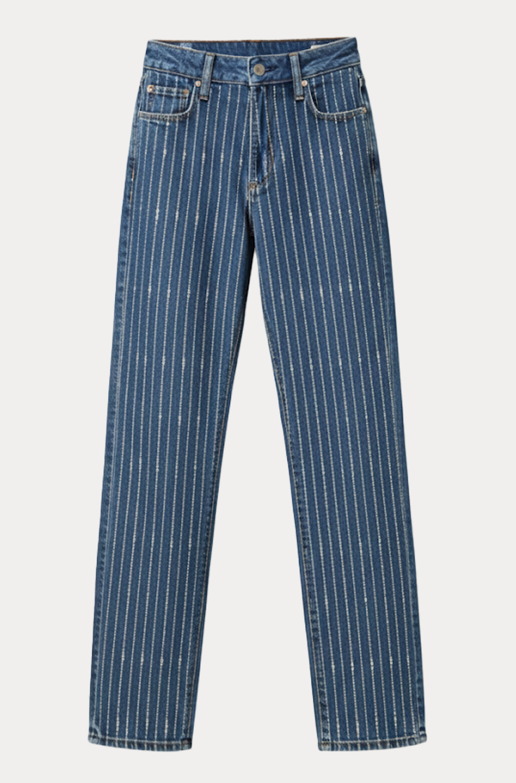 A standout take on a classic high-rise straight leg. In a versatile medium wash, elevated with vertical pinstripe gradient rhinestones that sparkle down the front, this pair is crafted from heritage-inspired denim with a soft hand-feel and a hint of stretch.