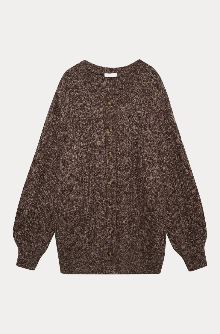 Embrace your soft side with the Nathalie Knit oversized cardigan, perfect for your soft afternoon wardrobe. Crafted in a cozy cable knit, this brown cardigan features a functional tortoiseshell button front and classic ribbed trims at cuffs and hem.