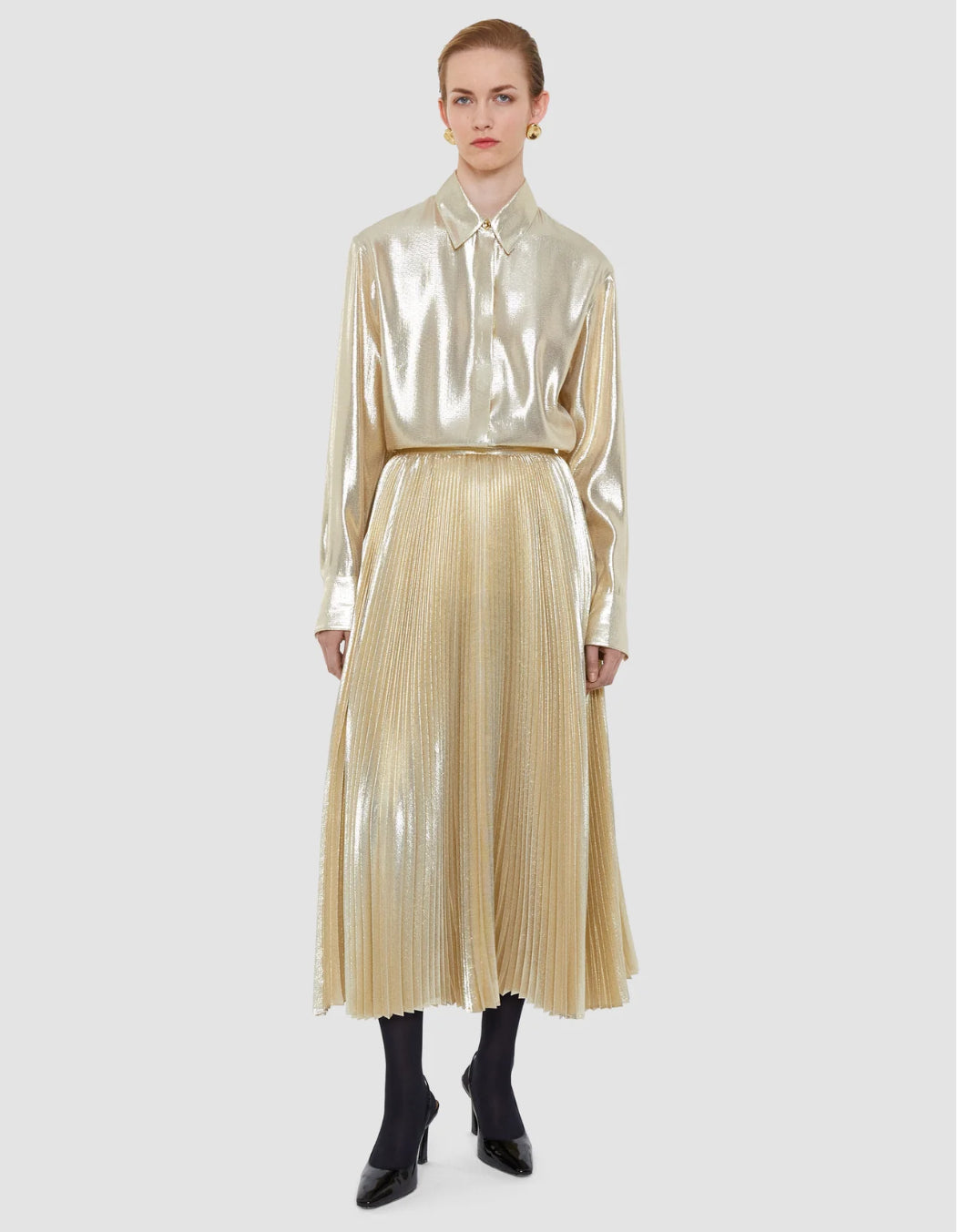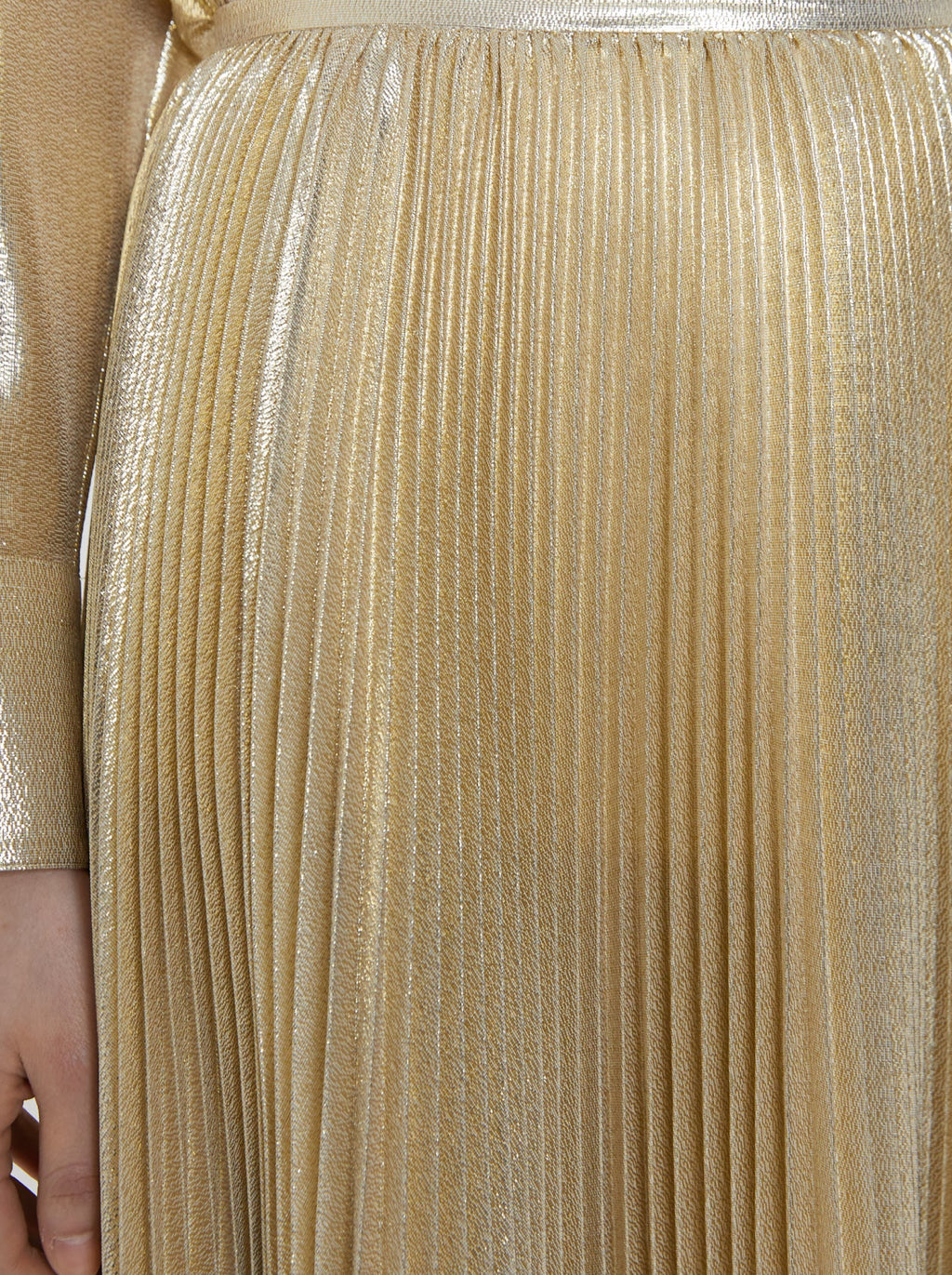 The Essai Lamé Silk Skirt is a pleated, mid-length design, crafted from a luxurious blend of silk and metallic fibres in gold and silver. The fine pleats enhance the fluid drape of the silhouette, catching the light with every movement. It’s an ideal piece for festive dressing, bringing a sense of modern glamour to evening or occasion looks.