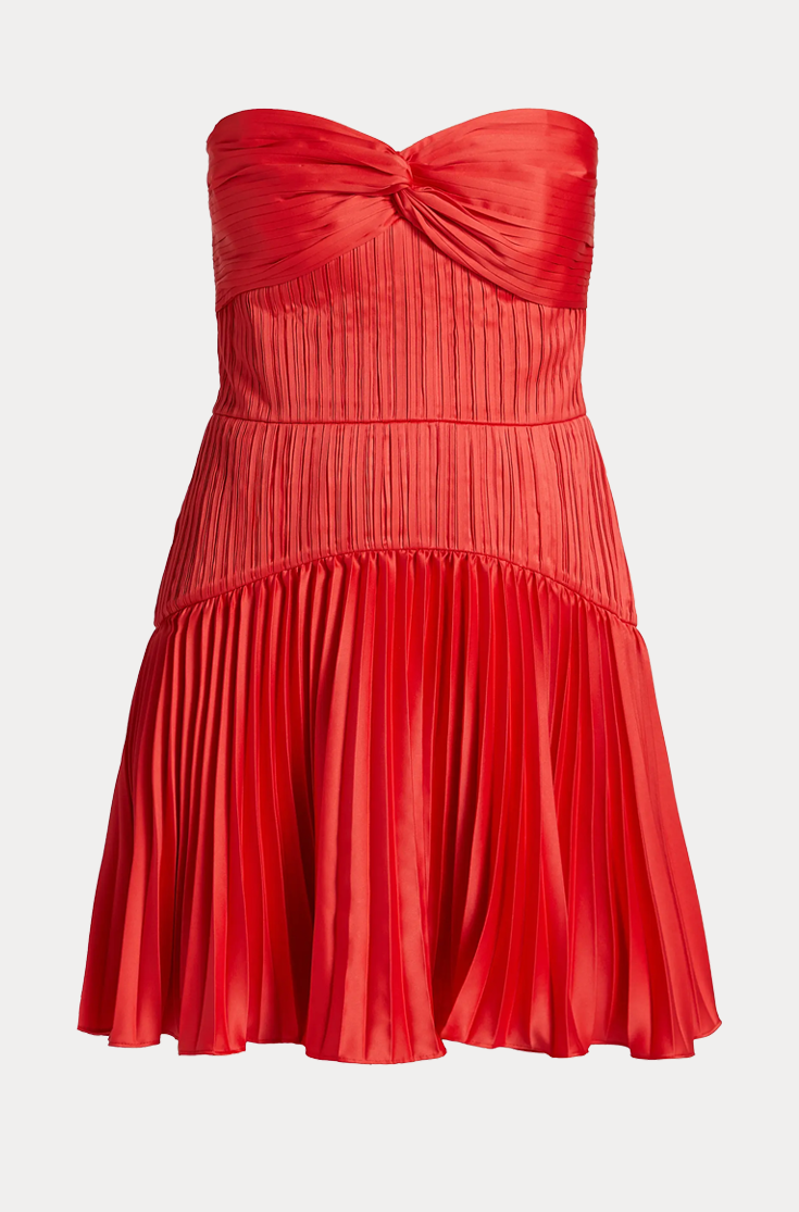 Strapless and unapologetic, this mini dress brings the drama with a sculpted bell bodice and drop waist. Finished with a sunburst-pleated skirt made for twirling, it’s your excuse to outshine the sunset.