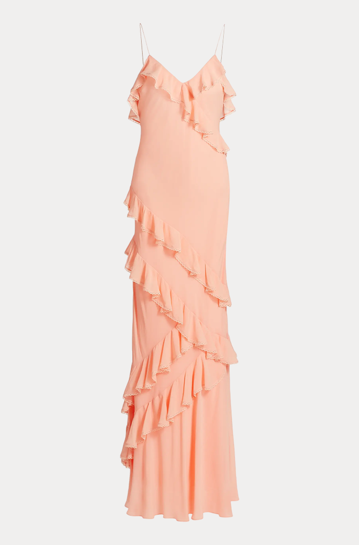 Our best-selling Rialto Dress returns with a silky, drapey fabric for the season with bright, vibrant colors. This must-have party maxi stuns with overlapping, asymmetrical ruffles at the neckline that continue to descend through the entire skirt. Slightly fitted, this dress features a sexy silhouette.