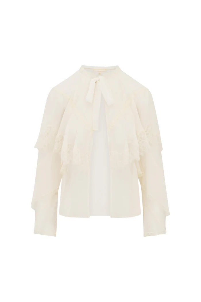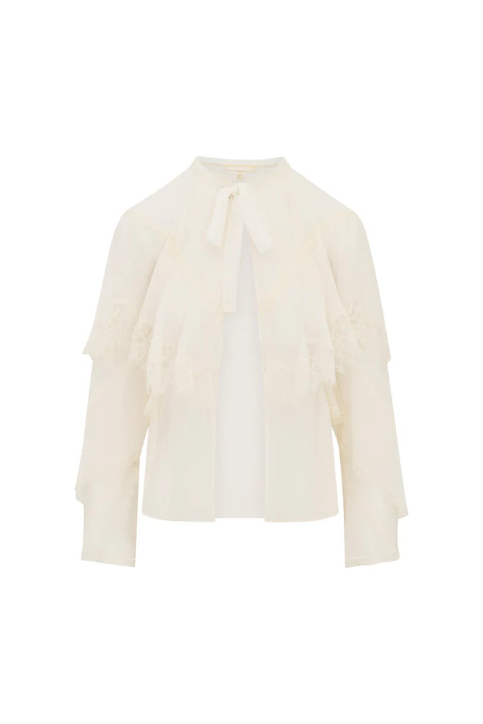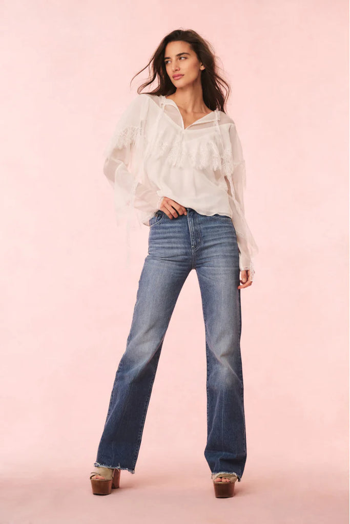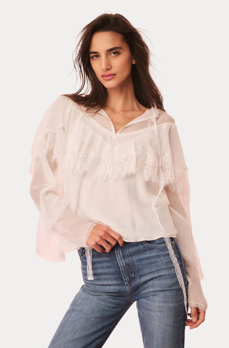 Elevate your wardrobe with the Afton Blouse. This pretty piece debuts in 100% silk with a drapey, chiffon giving this top a Bohemian-inspired look and feel. With a 70s-inspired silhouette, the top begins with ruffles along the shoulders and around the body. Long bell sleeves feature self-covered buttons and delicate lace ties at the neck. Lovely styled laces are inserted into the ruffles for a stunning added detail. The piece includes a removable georgette cami so you can wear it sheer or not sheer.
