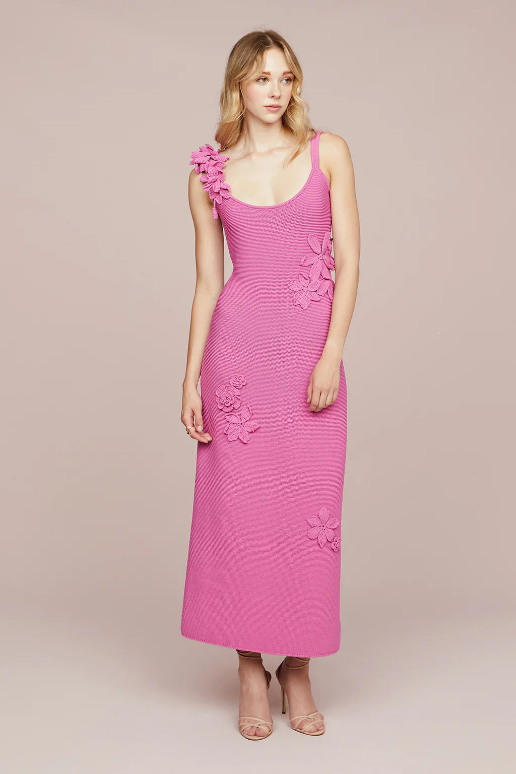 Dense sponge knit adorned with hand-crocheted flowers cascading across the body. A bold statement shoulder adds a unique, textural touch.